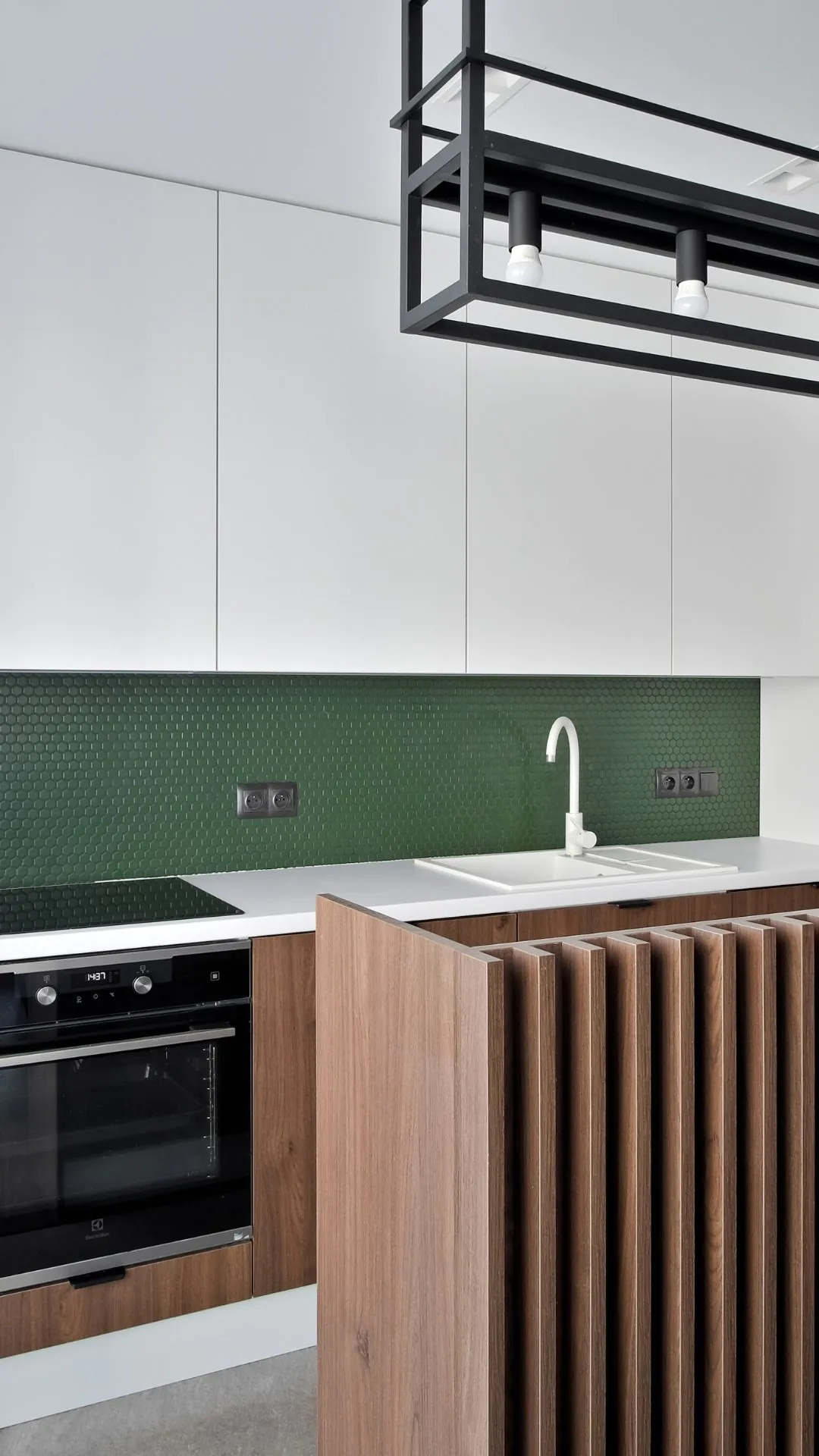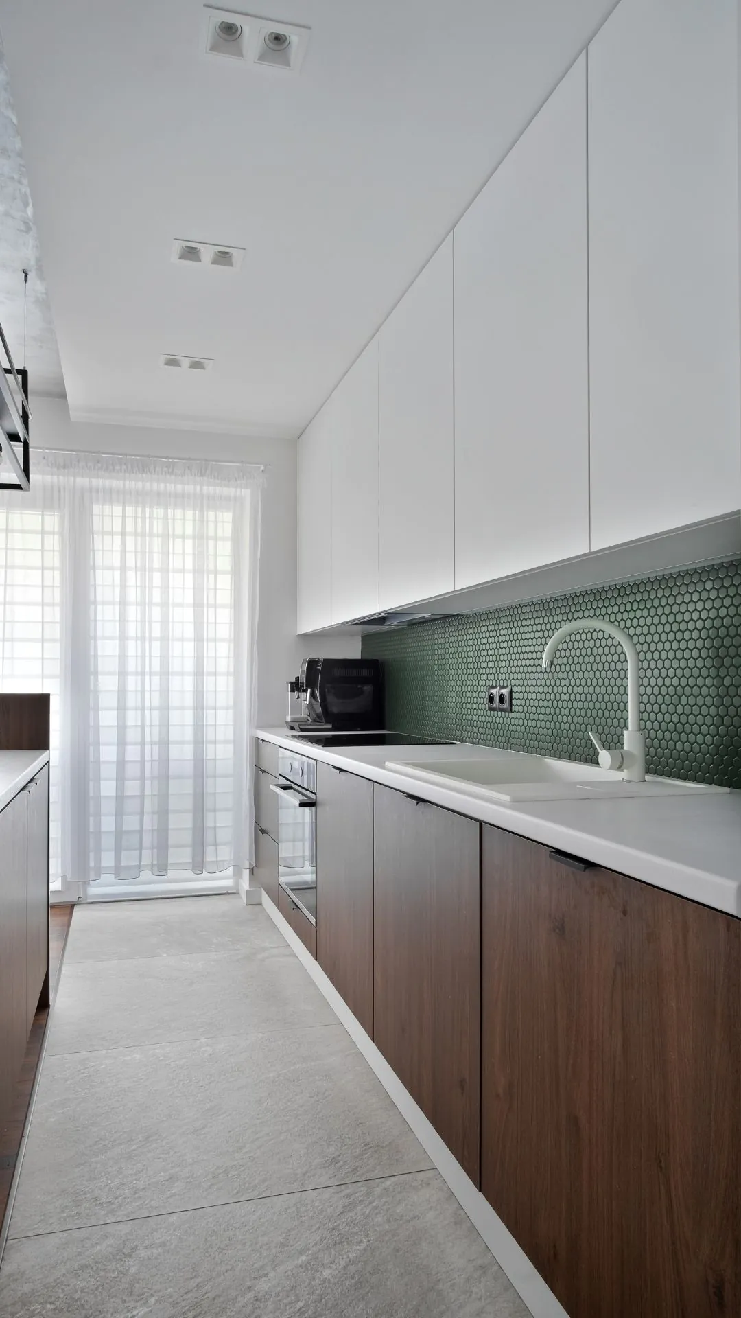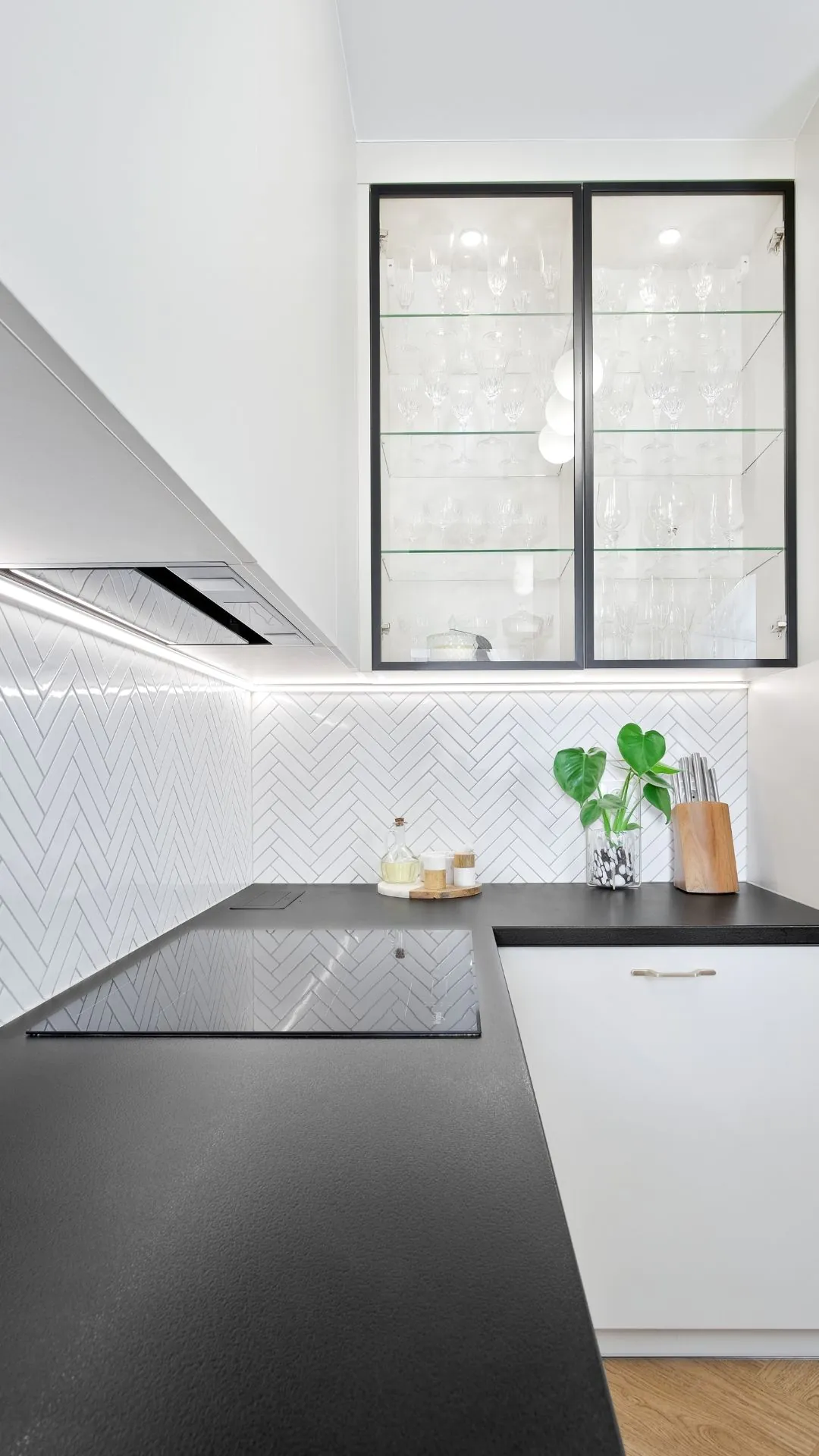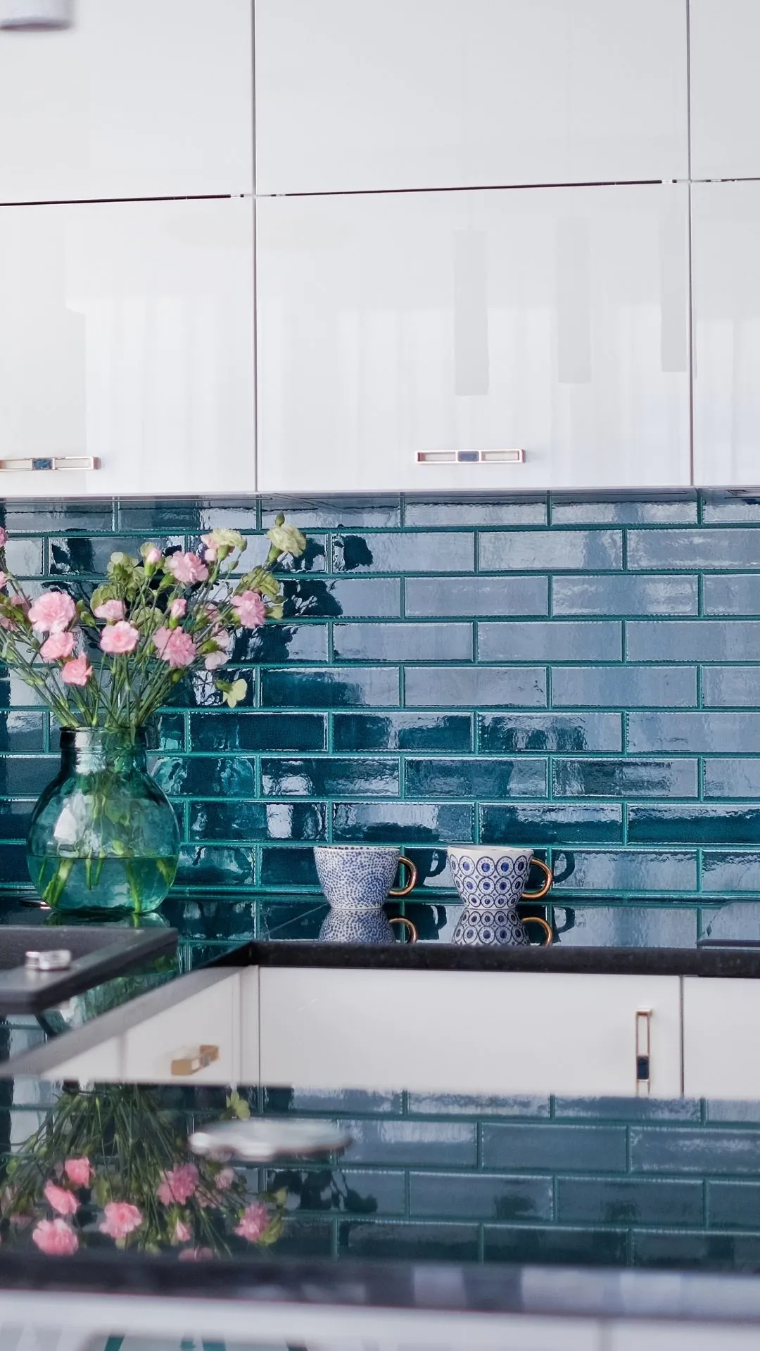 Bucătăria cu mobilier alb și lucios și blatul negru în contrast creează o simetrie estetică și rafinată, subliniată suplimentar de plăcile Metropolis Dark Sea așezate între dulapuri în stilul clasic al cărămizii. Utilizarea unui chit într-o culoare apropiată de cea a plăcilor nu doar că unește elegant elementele, dar pune și în evidență adâncimea culorii acestora, adăugând interiorului un caracter și un contrast deosebit.