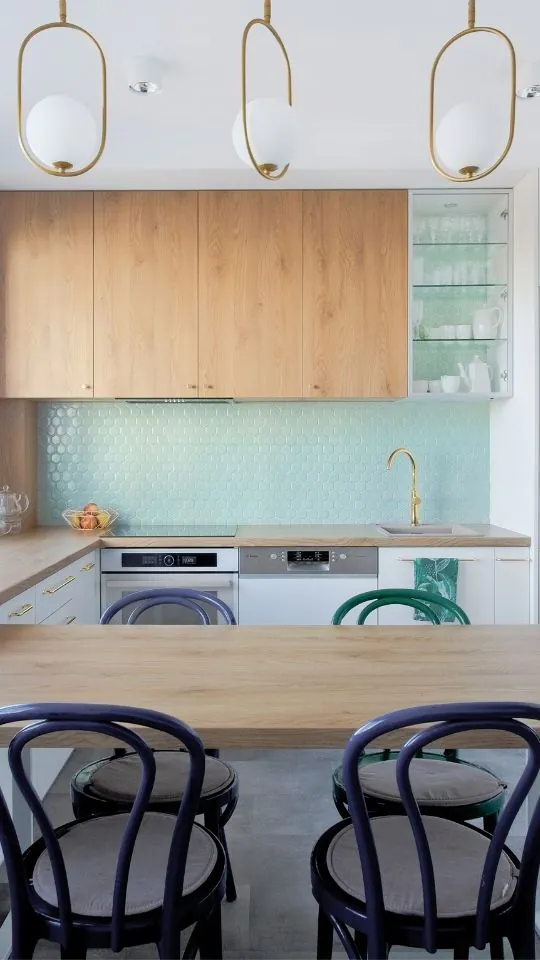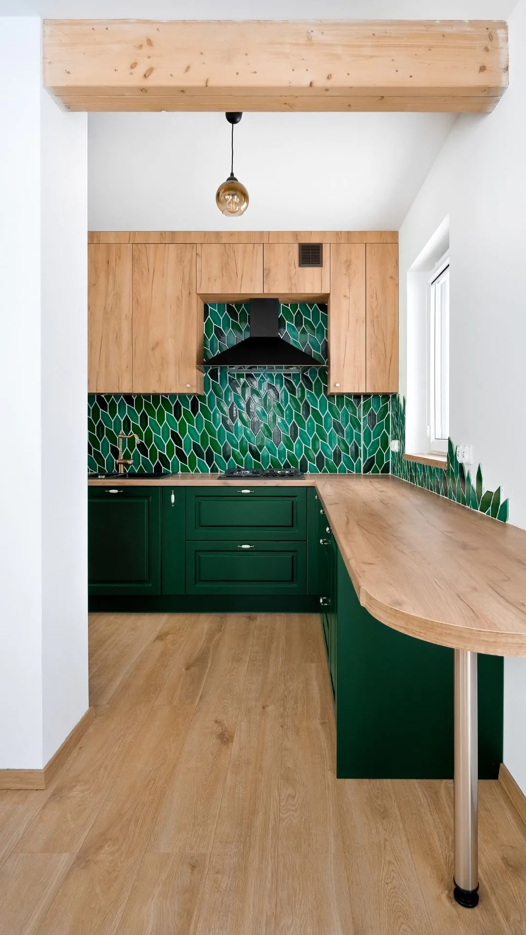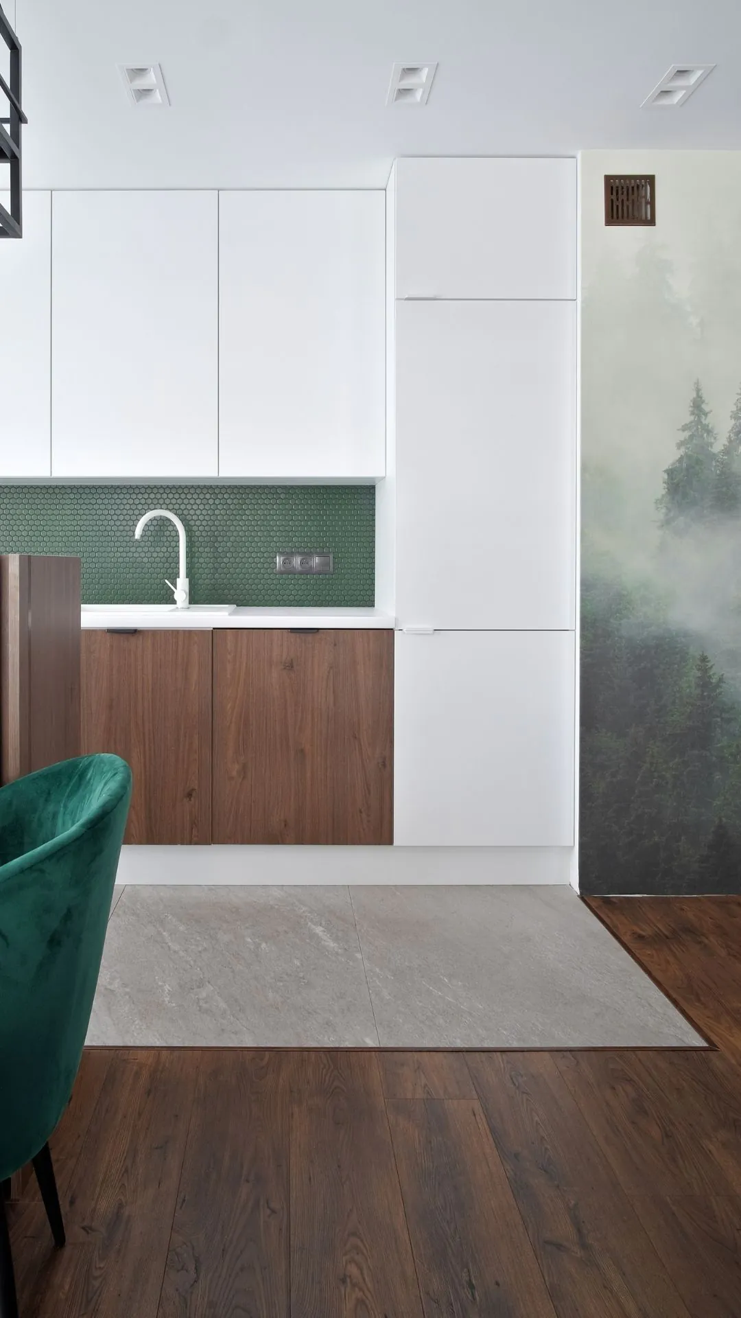Bucătăria deschisă către zona de dining nu este doar un loc pentru prepararea mesei. Suprafața pe care o oferă această soluție permite posibilități nelimitate de amenajare. O amenajare atmosferică cu un motiv forestier va câștiga un plus de caracter cu plăcile și mobilierul alese corespunzător. Plăcile Hexagon Mic Verde Închis Mată și mobilierul de bucătărie cu secțiuni colorate sunt o idee excelentă pentru a îmbunătăți tapetul forestier adiacent.