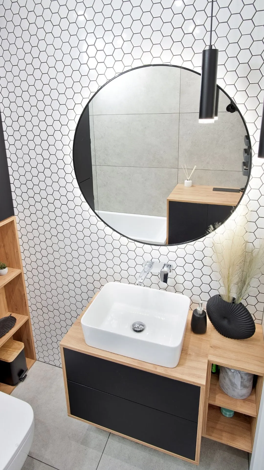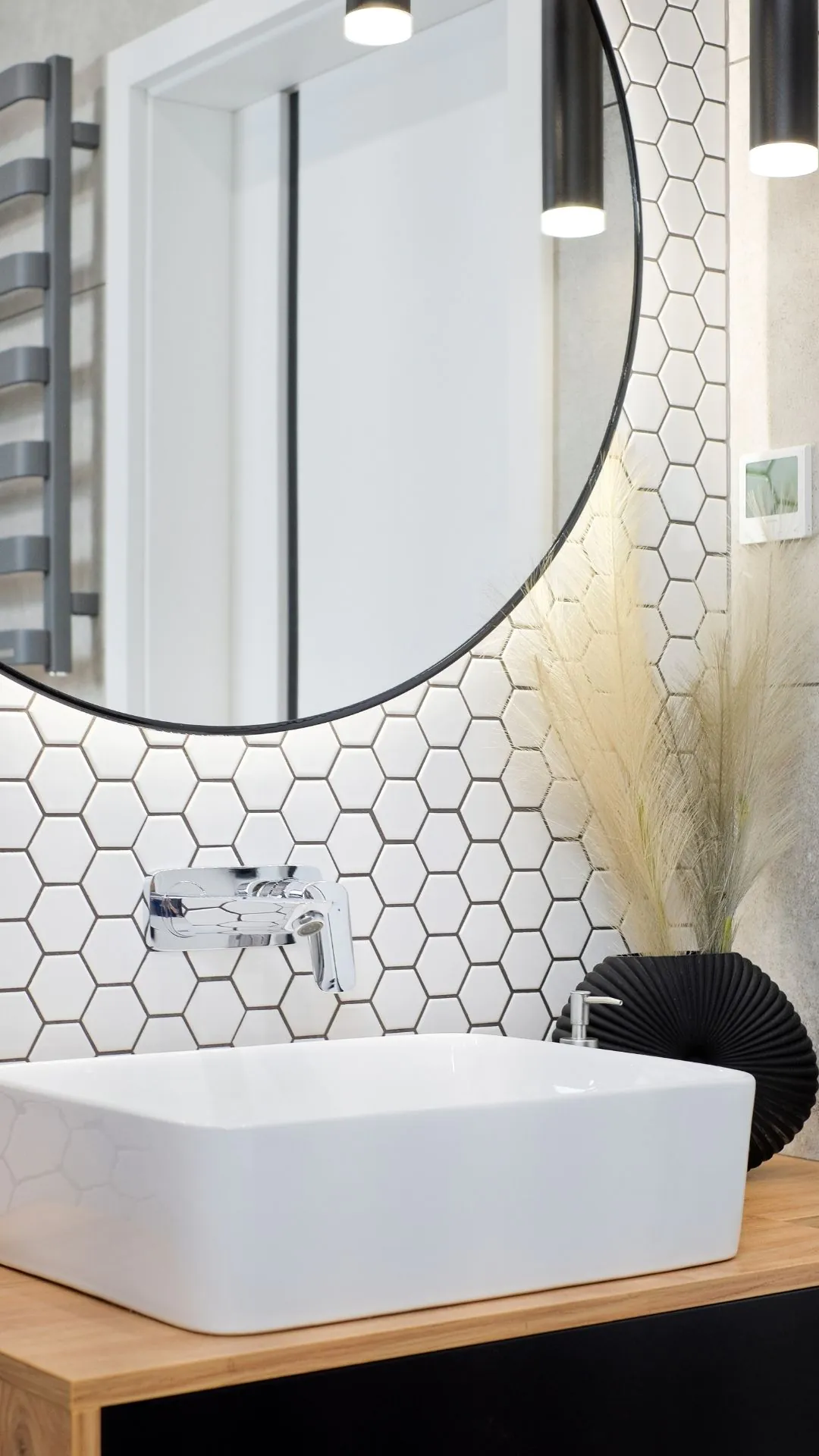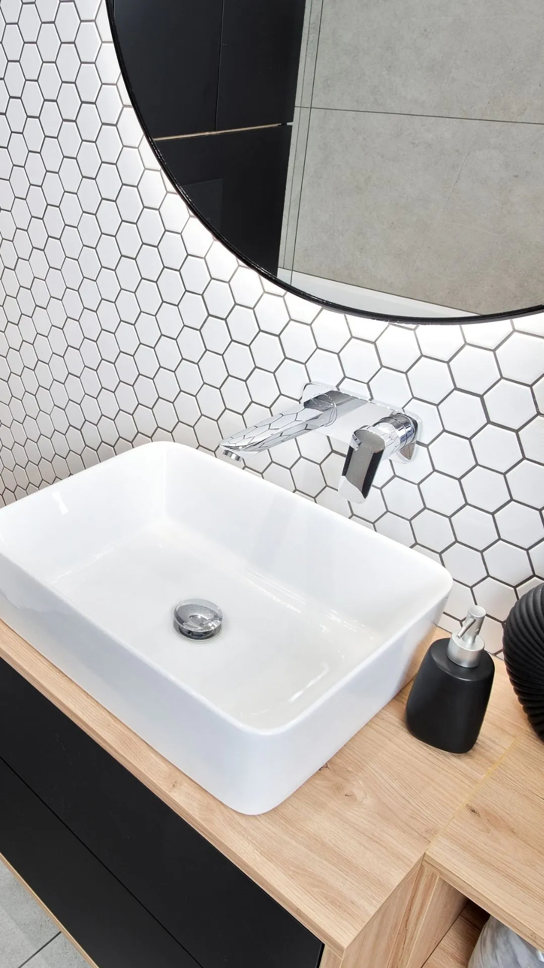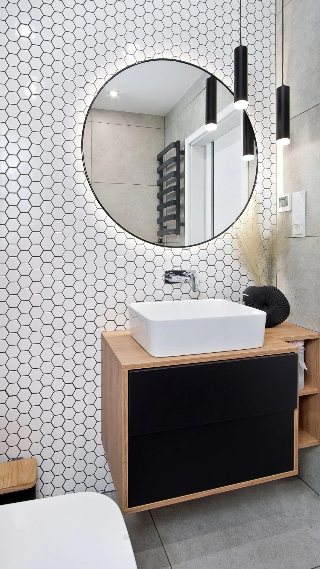 Veșnic la modă! Întreaga suprafață a peretelui acoperită cu plăci Heksagon Mare Alb Mată nu este doar o decorațiune. Plăcile ceramice protejează peretele de umezeala excesivă și apa care stropiște. În plus, heksagonul se potrivește perfect cu oglinda rotundă cu ramă neagră.