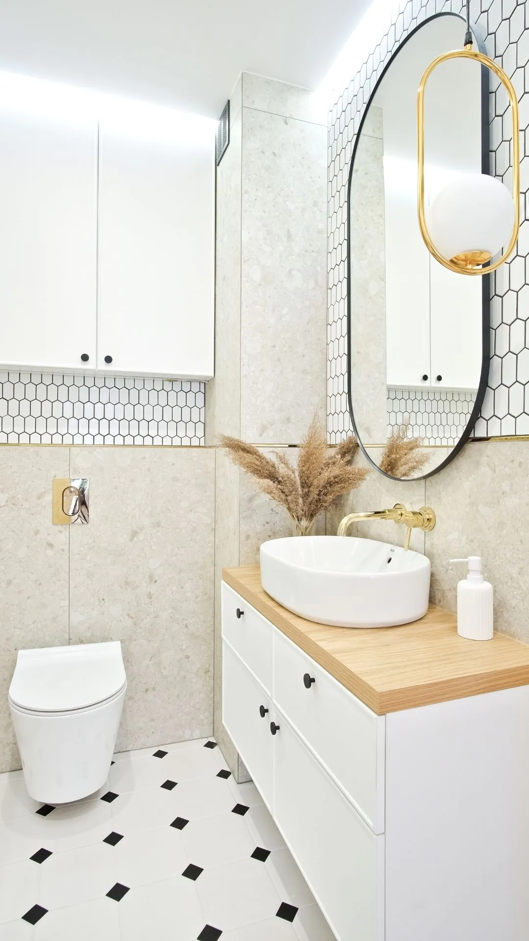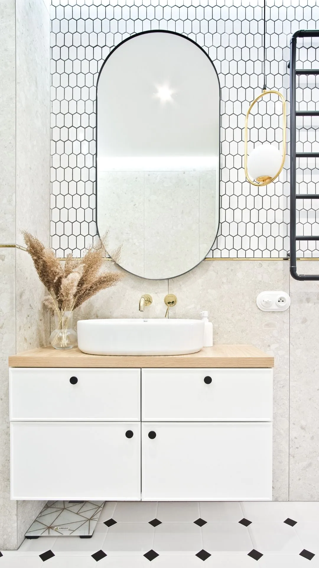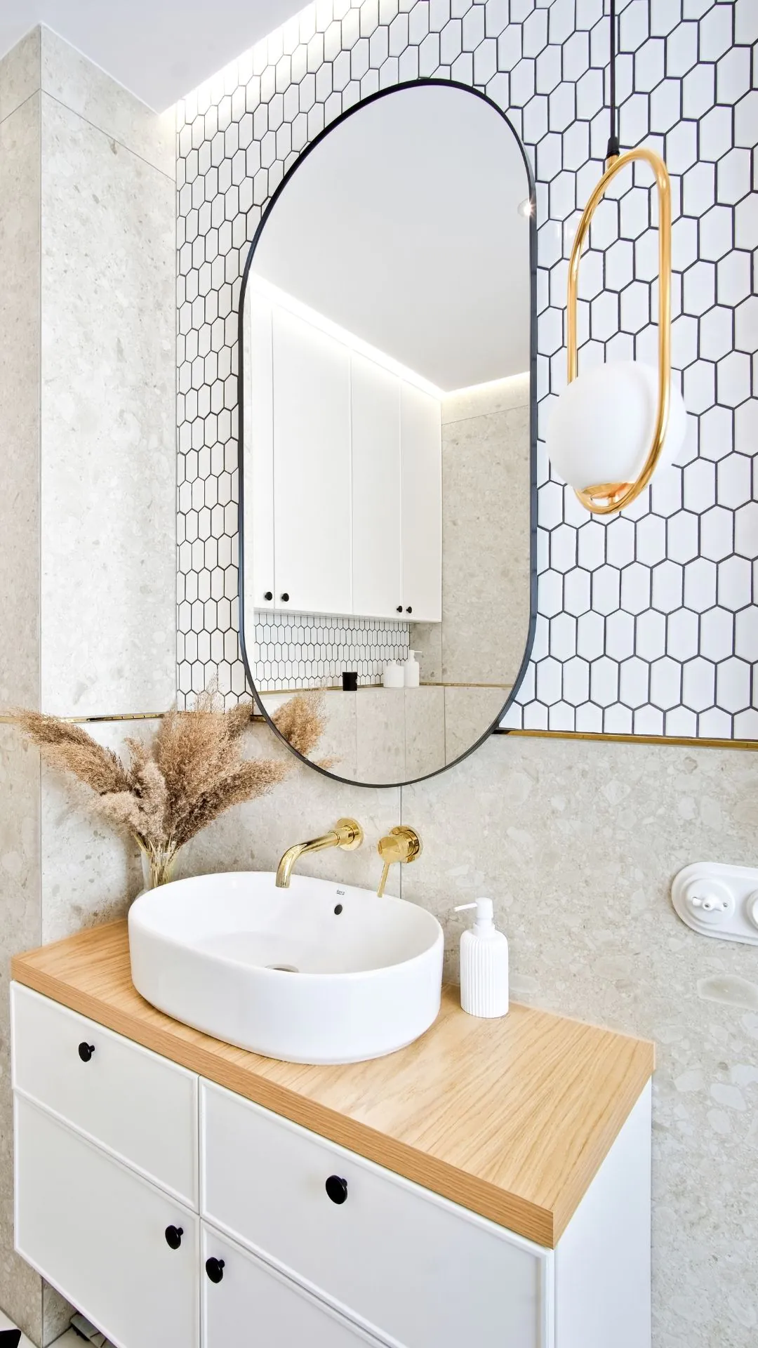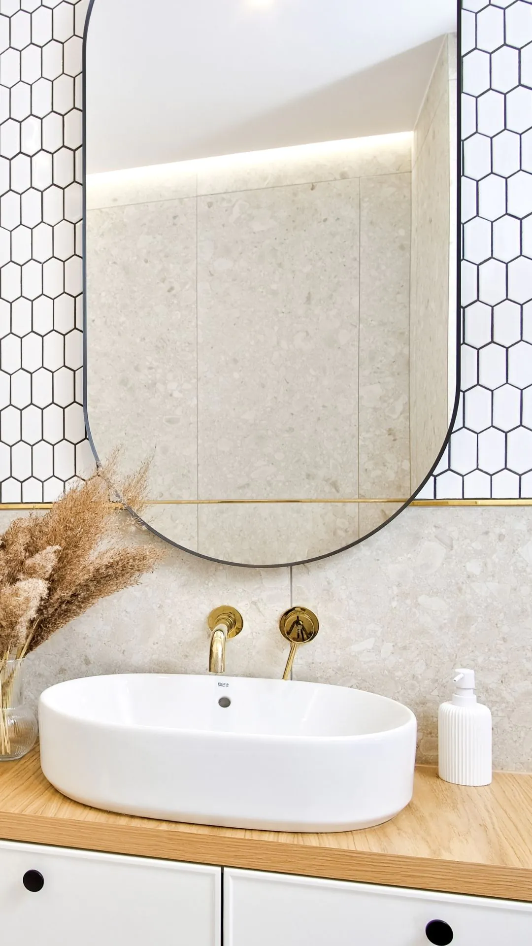 Veșnic la modă! Întreaga suprafață a peretelui acoperită cu plăci Heksagon Mare Alb Mată nu este doar o decorațiune. Plăcile ceramice protejează peretele de umezeala excesivă și apa care stropiște. În plus, heksagonul se potrivește perfect cu oglinda rotundă cu ramă neagră.