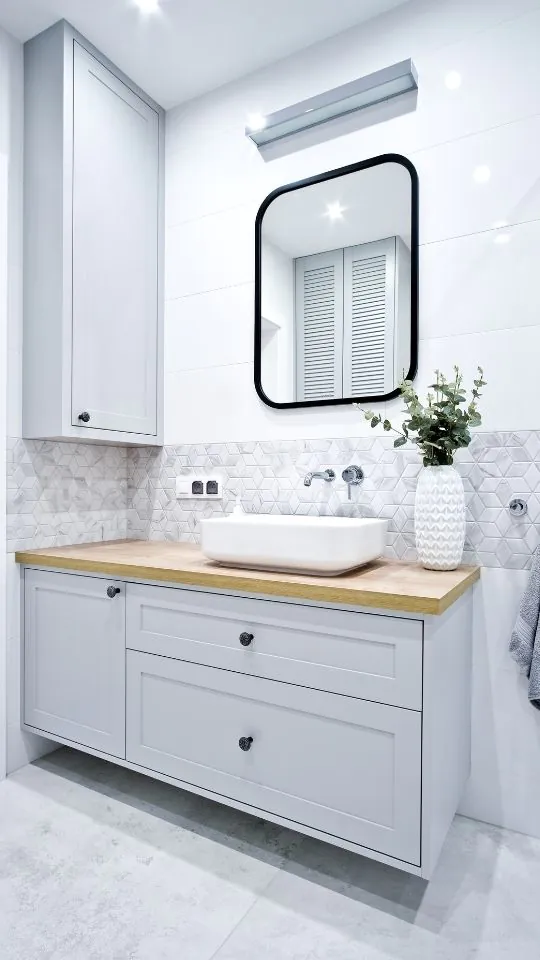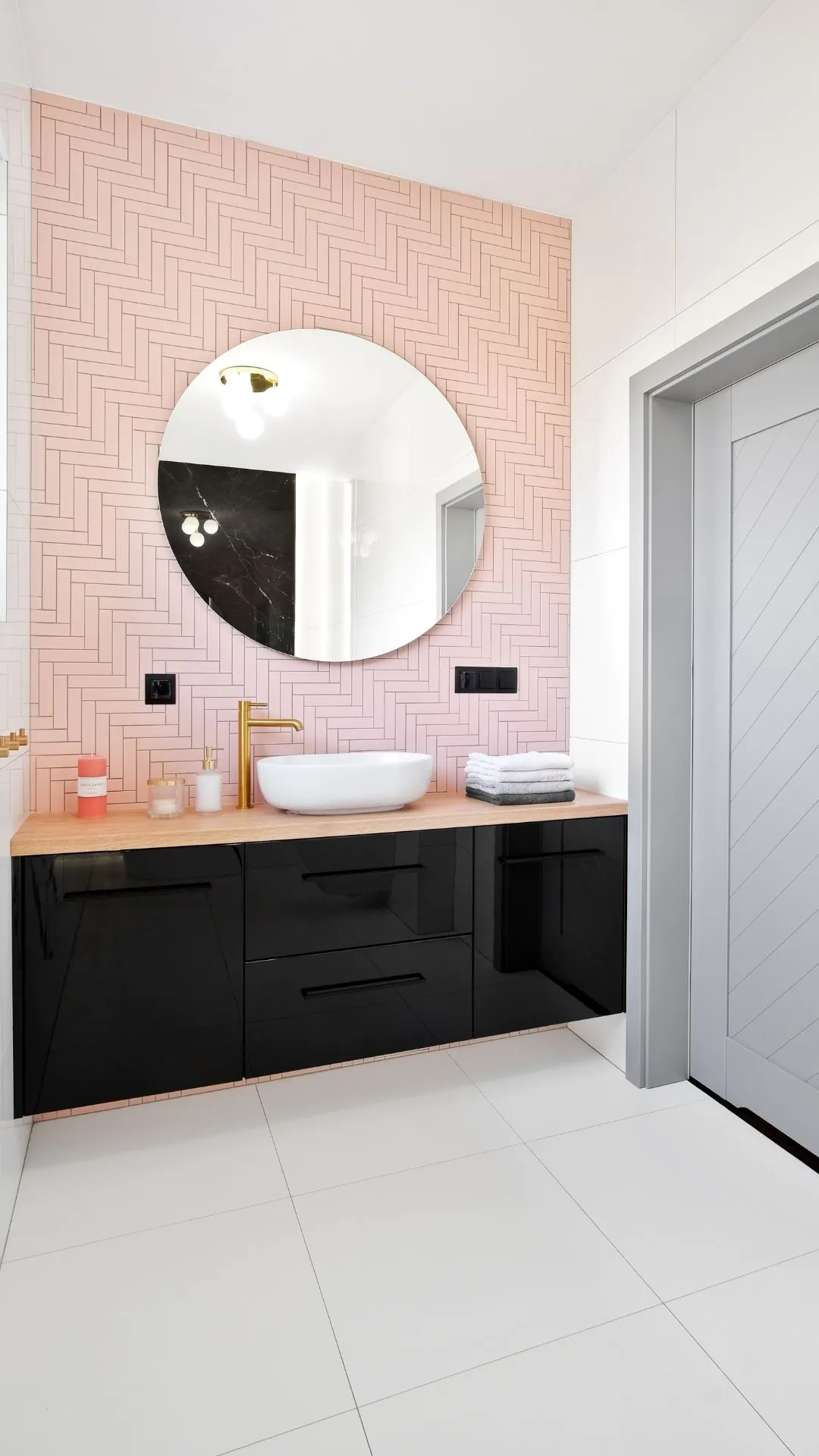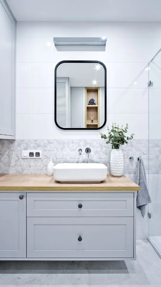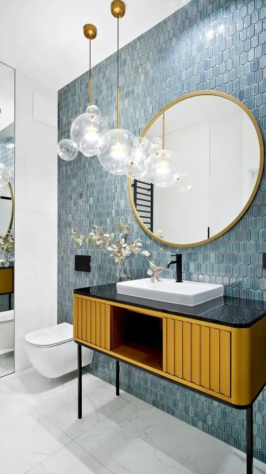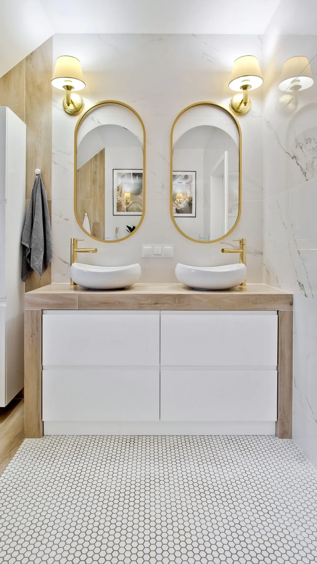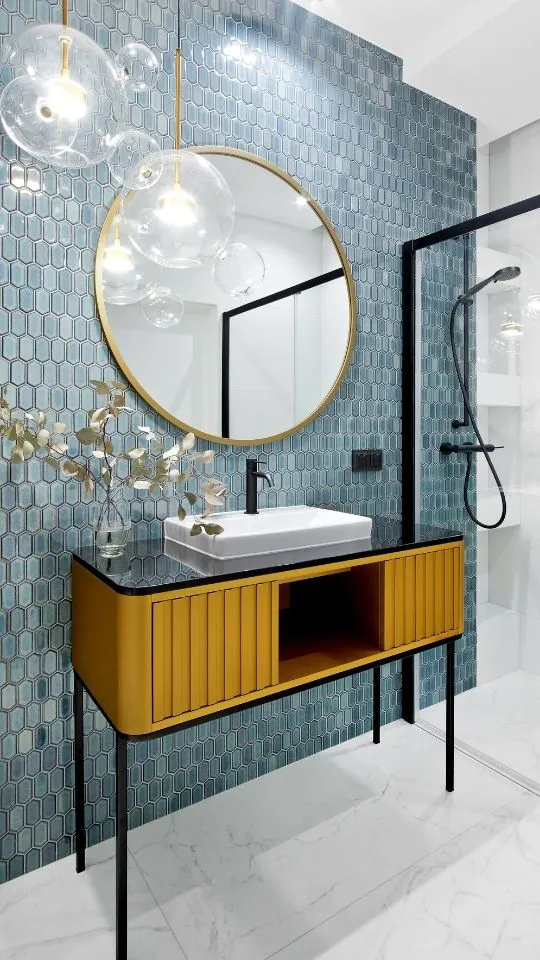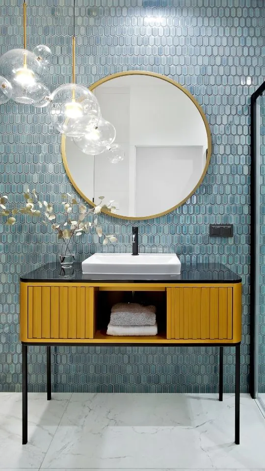 Veșnic la modă! Întreaga suprafață a peretelui acoperită cu plăci Heksagon Mare Alb Mată nu este doar o decorațiune. Plăcile ceramice protejează peretele de umezeala excesivă și apa care stropiște. În plus, heksagonul se potrivește perfect cu oglinda rotundă cu ramă neagră.