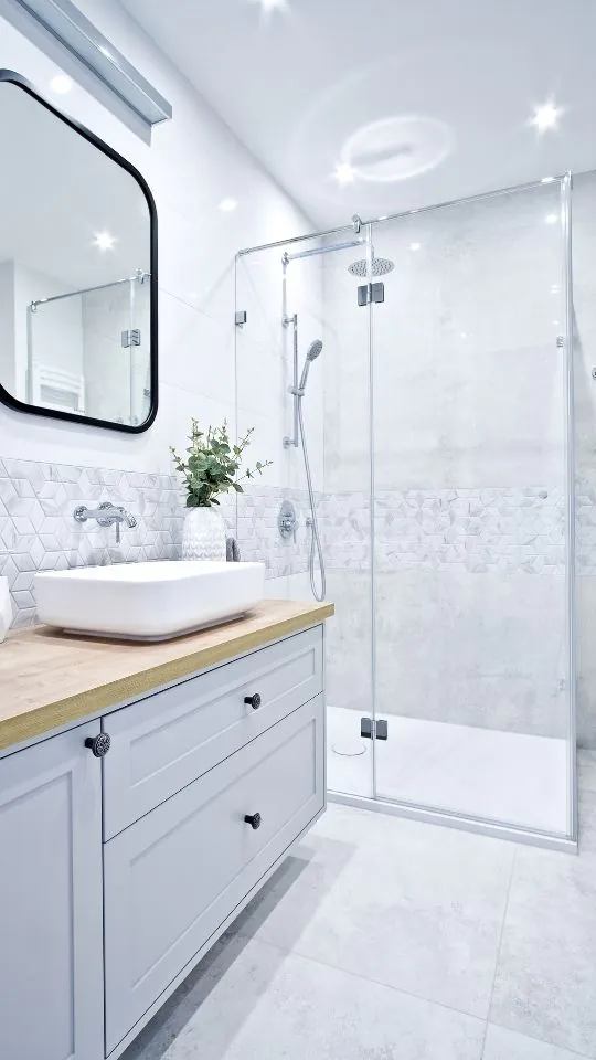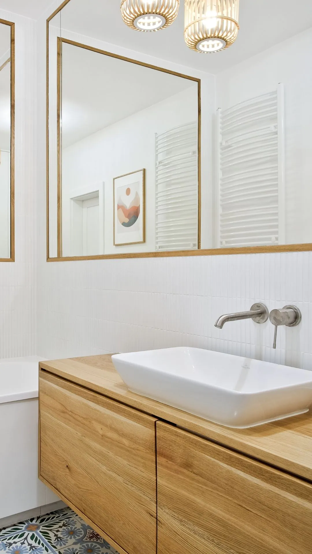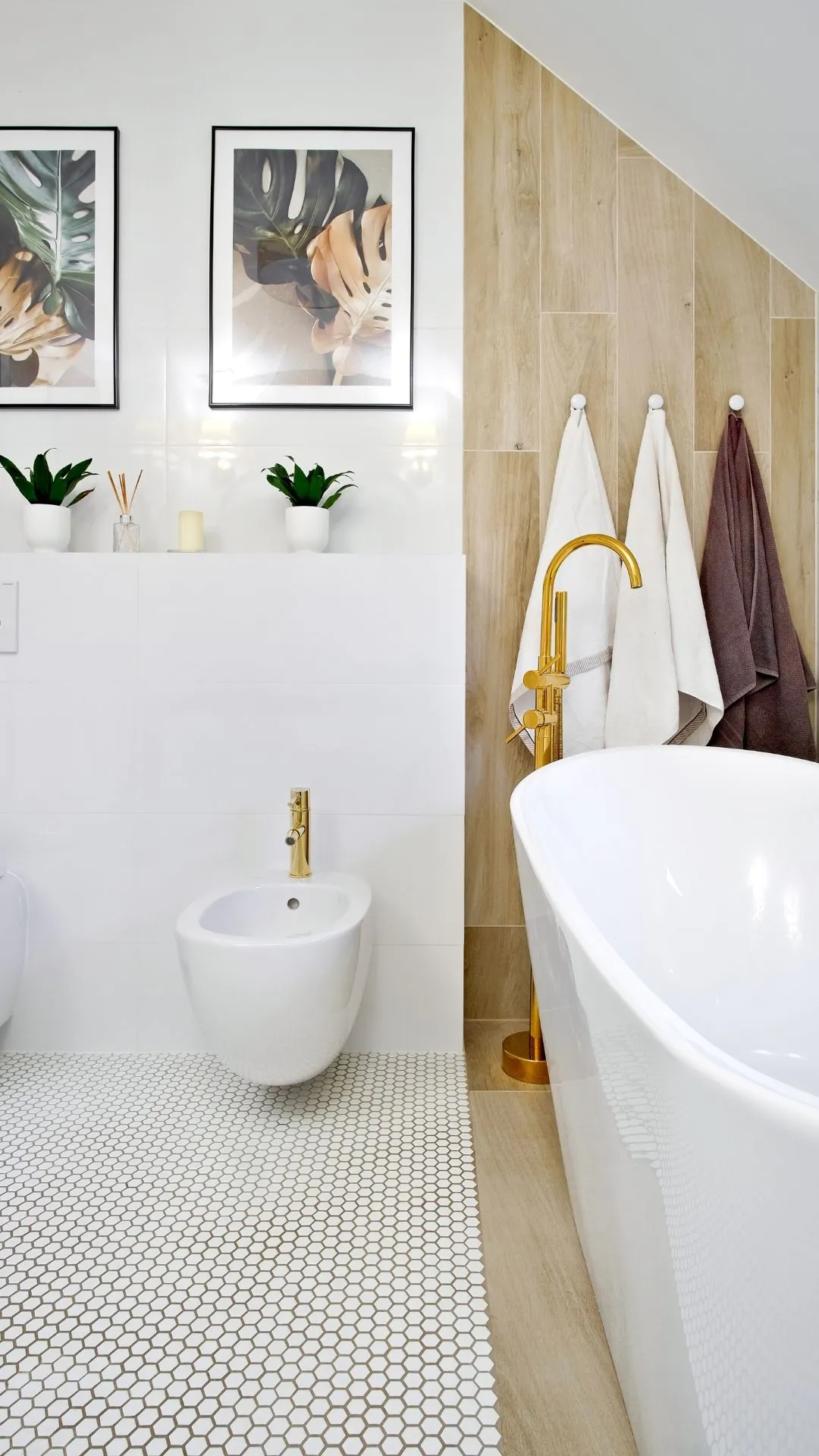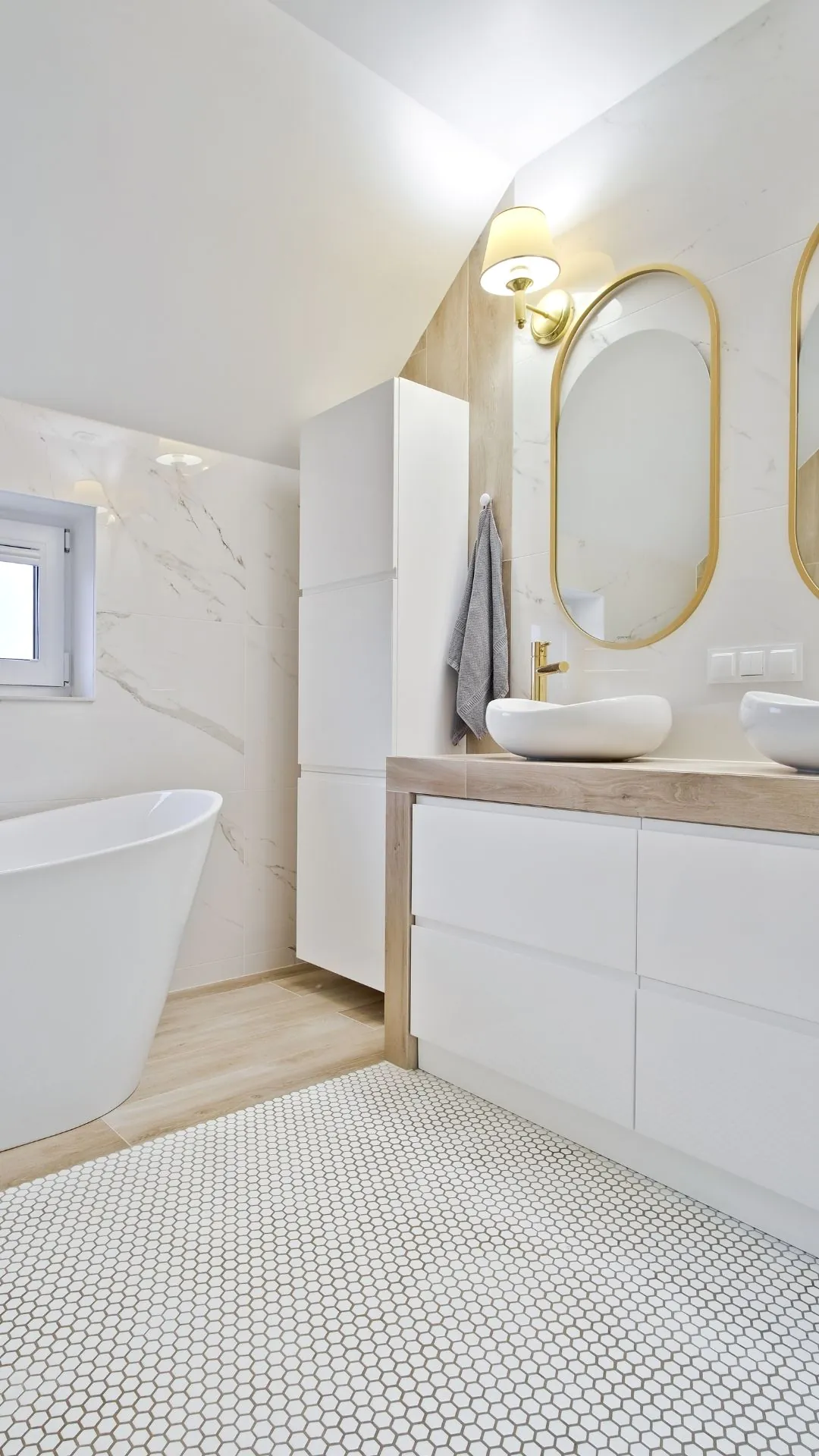 Baie cu înclinație - dilemă de amenajare? Nici pe departe! Într-o încăpere înaltă poți plasa cu ușurință o cadă freestanding, o toaletă și un dulap mare sub chiuvetă, precum și oglinzi elegante. Separarea unei secțiuni din lemn lângă cadă a permis expunerea plăcutului mozaic Hexagon Mic Alb Mată, pe care poți merge fără teama de a aluneca.