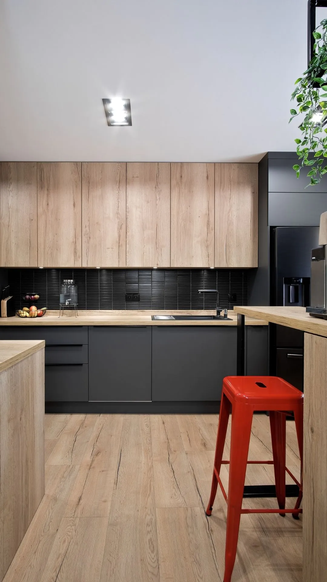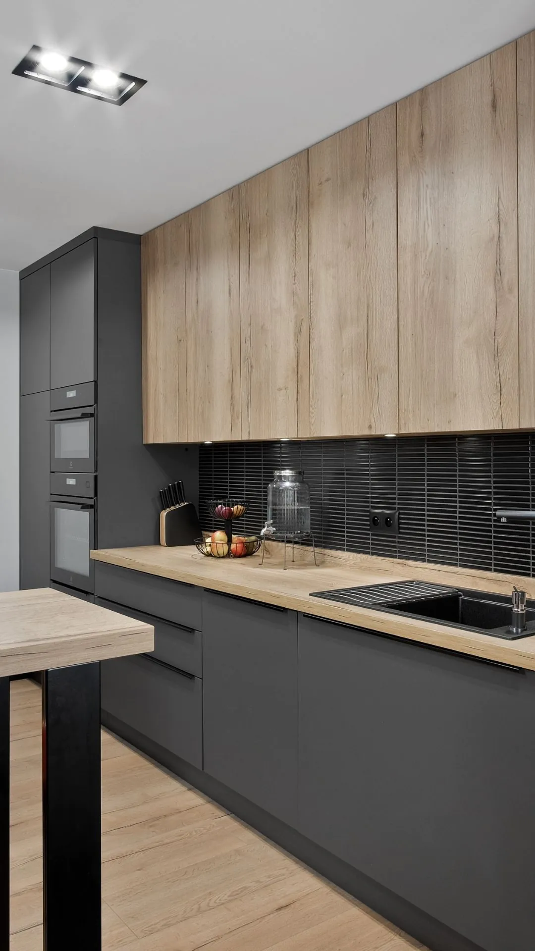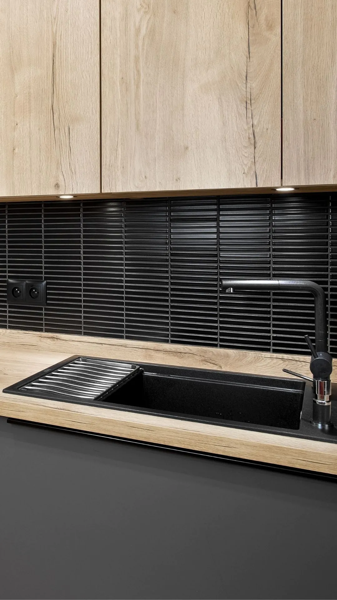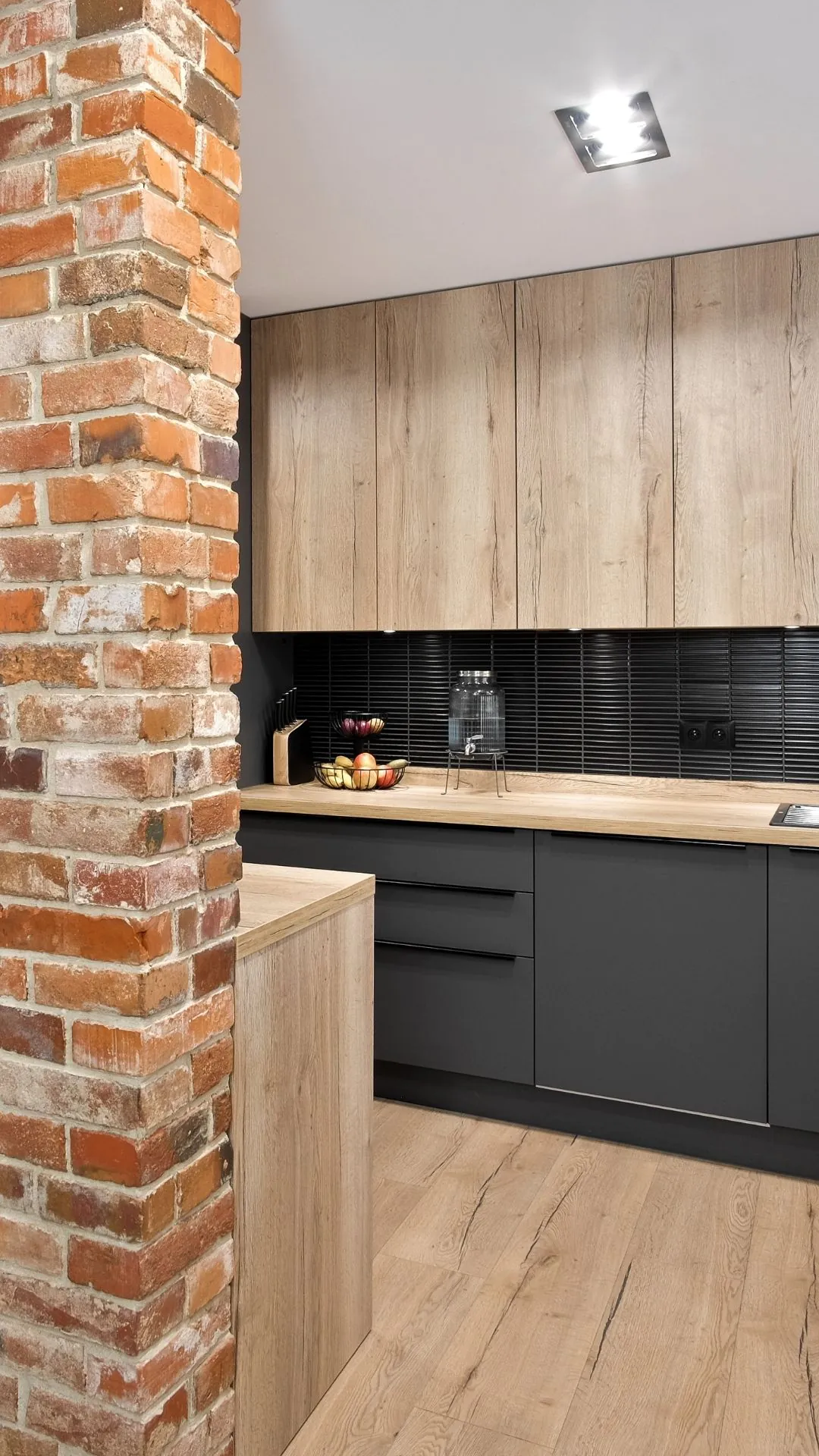 Negru, lemn și cărămidă - această alegere de culori și materiale este apreciată în interiorul bucătăriilor. Mobilierul de bucătărie negru și plăcile Stick Negru Mată sunt o bază puternică, care a fost echilibrată cu fronturi de lemn pentru partea superioară și blat. Pilonul din cărămidă este o completare elegantă, iar întregul set de soluții folosite a creat o amenajare coerentă.