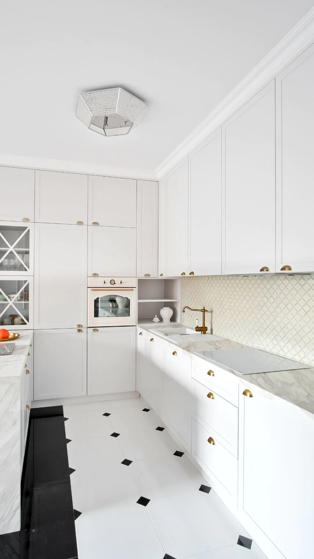 Este un interior atent gândit, îmbogățit cu soluții care nu vor perturba funcționalitatea încăperii. Mobilierul de bucătărie crem este o bază practică, care, împreună cu mozaicul Arabesque Mediu Cremă Lucioasă, nu se va potrivi doar într-o amenajare retro. Este suficient să faci câteva schimbări și interiorul va străluci cu o nouă lumină.