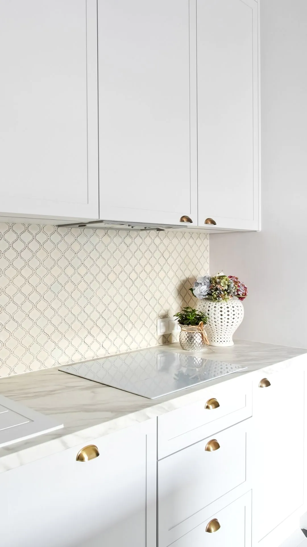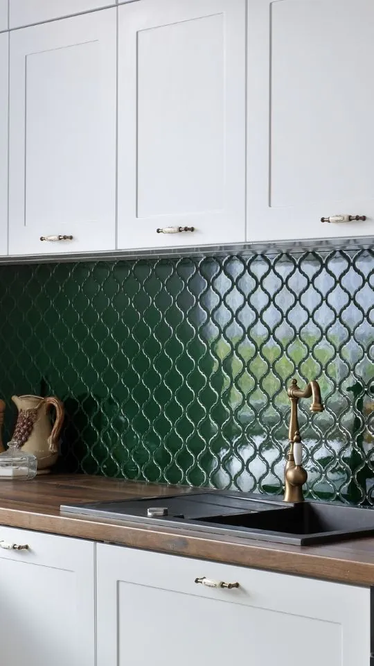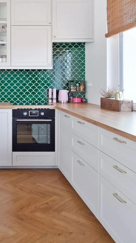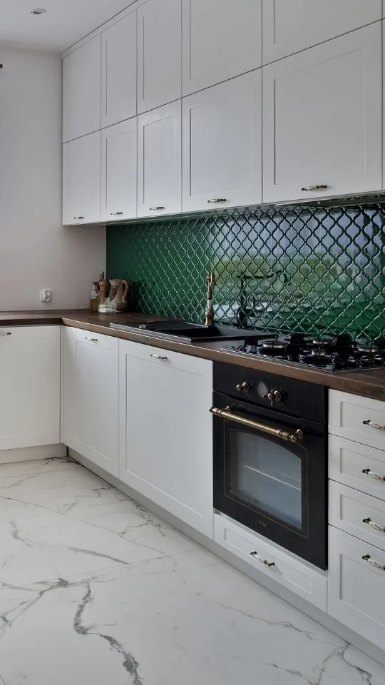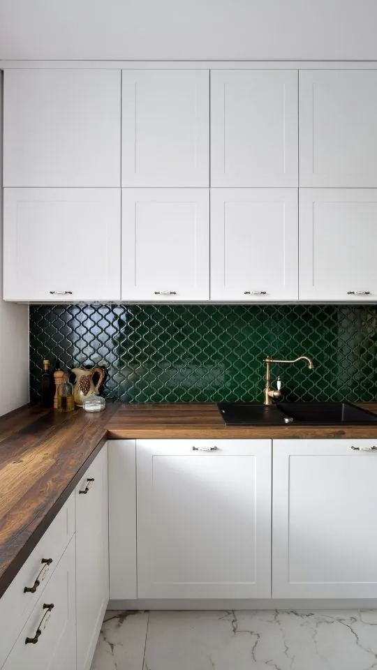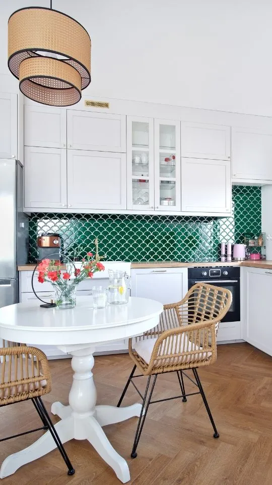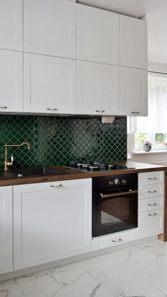 Este un interior care, prin căldura și liniștea sa, va fi perfect pentru iubitorii de gătit. Bucătăria cu fronturi albe, mânere decorative, blat din lemn și accesorii în stil pur rustic va fi completată prin utilizarea mozaicului Arabesque Mare Emerald Lucioasă.
