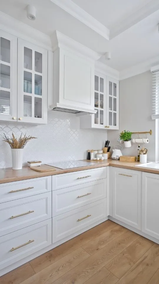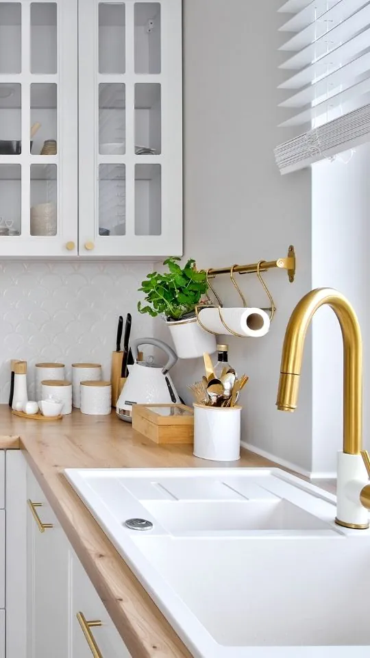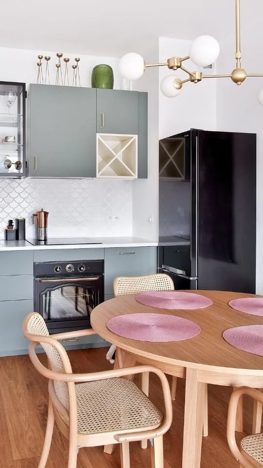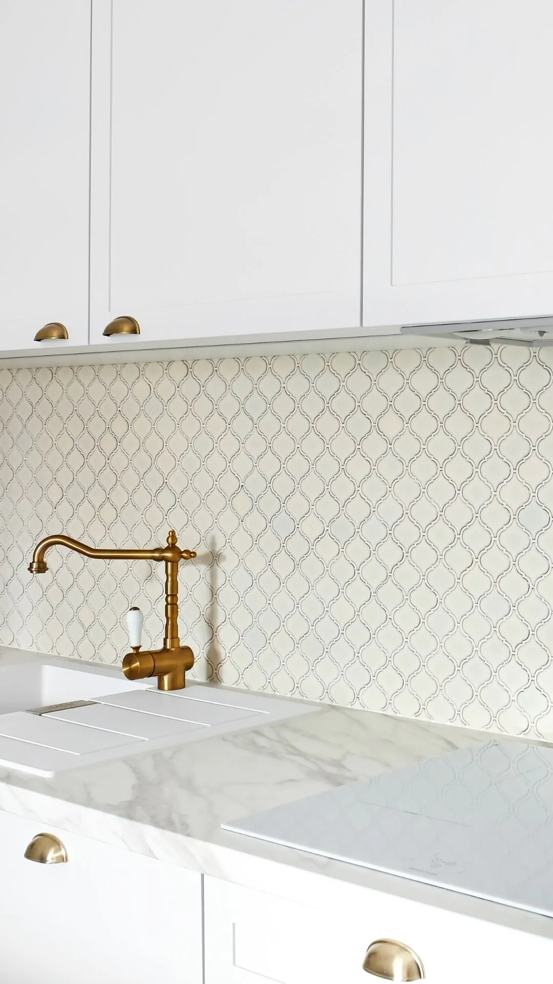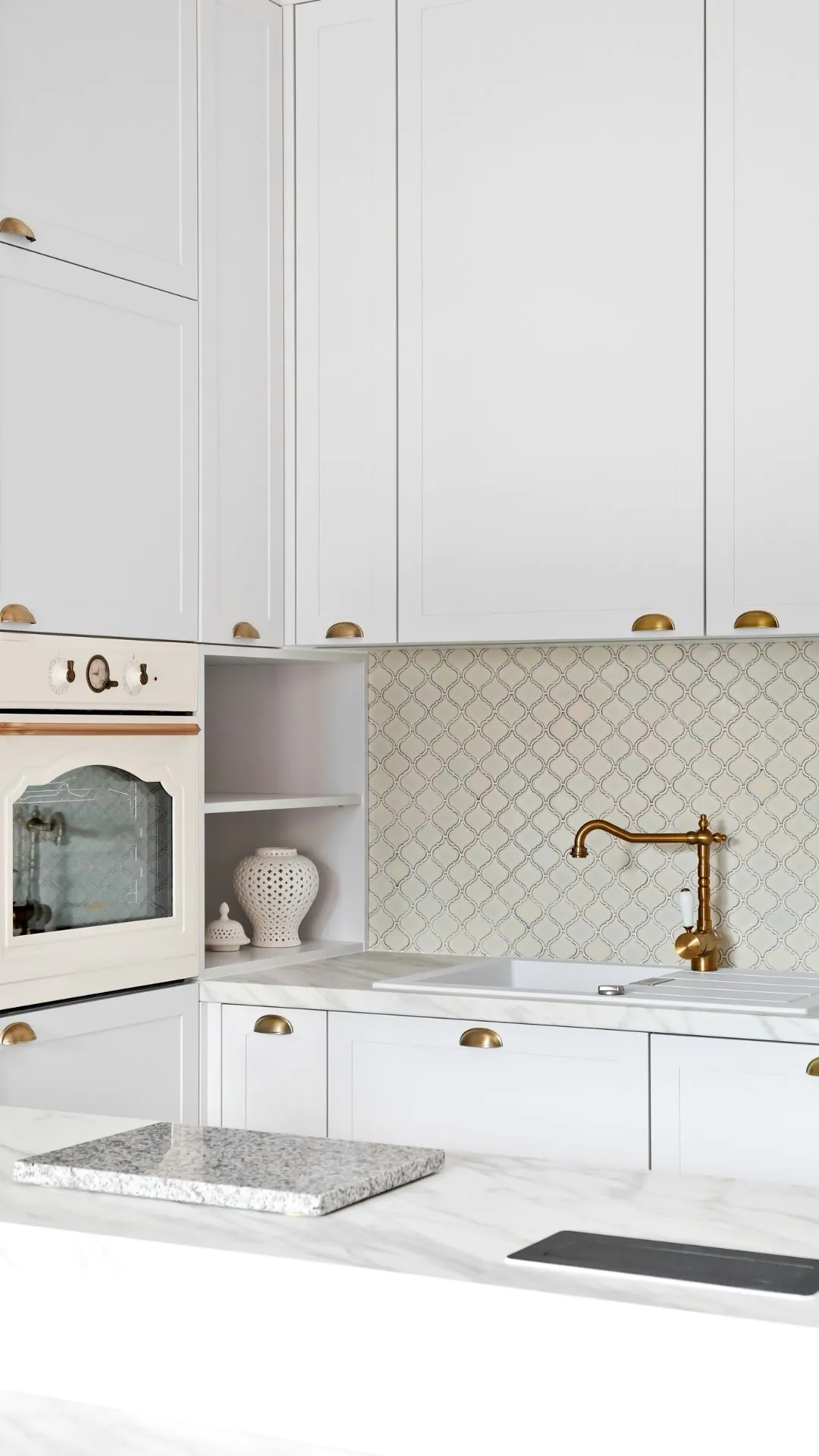 Este un interior care, prin căldura și liniștea sa, va fi perfect pentru iubitorii de gătit. Bucătăria cu fronturi albe, mânere decorative, blat din lemn și accesorii în stil pur rustic va fi completată prin utilizarea mozaicului Arabesque Mare Emerald Lucioasă.
