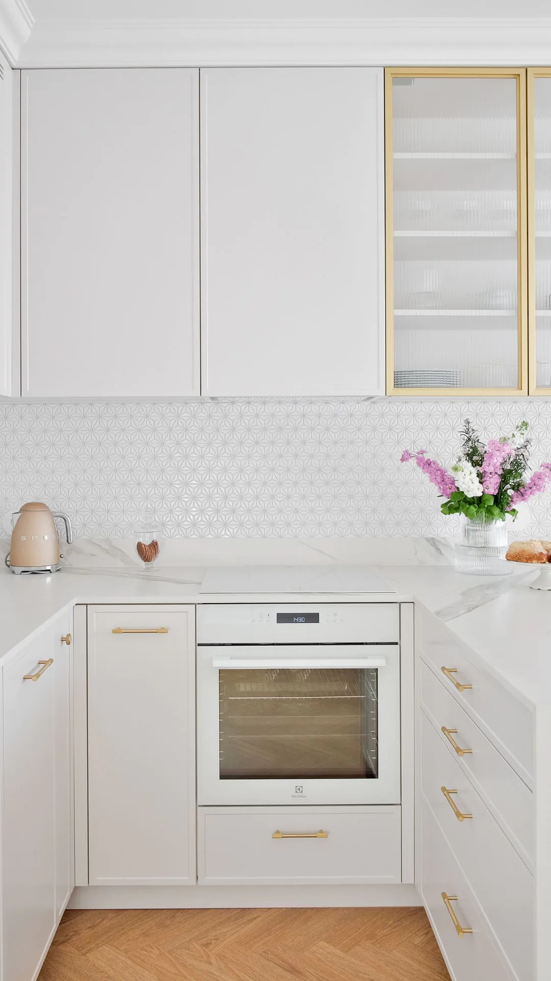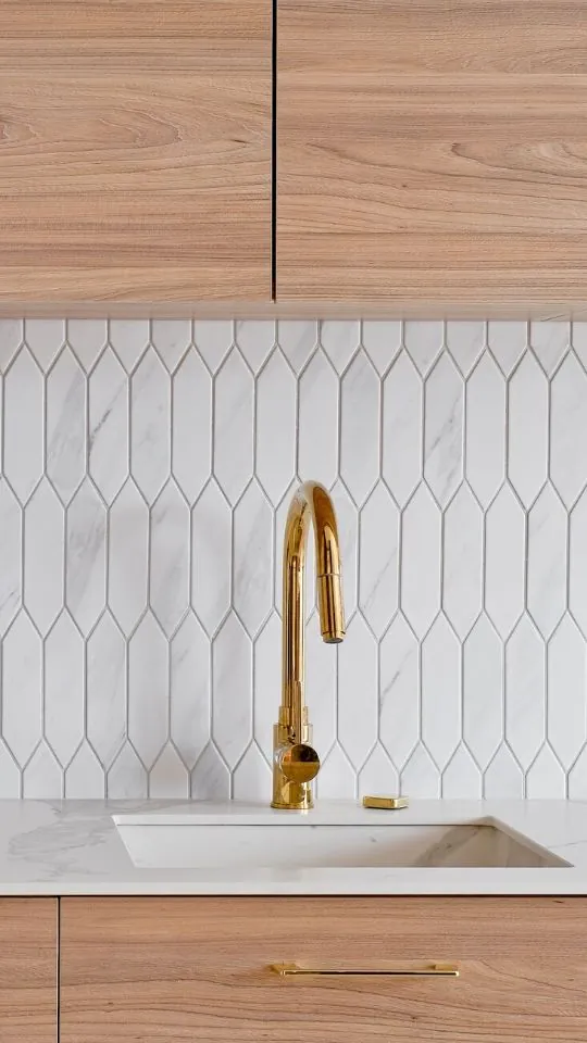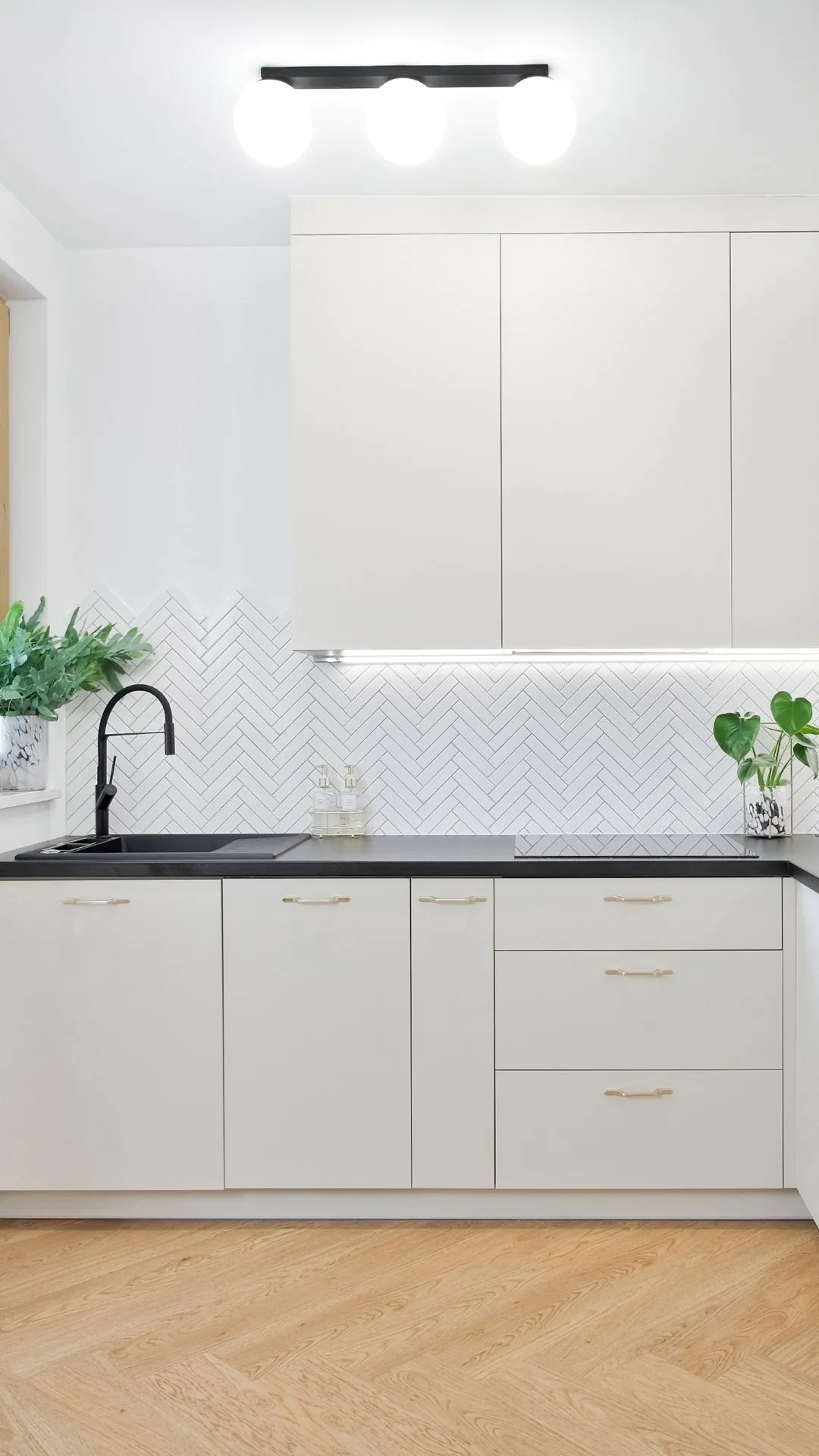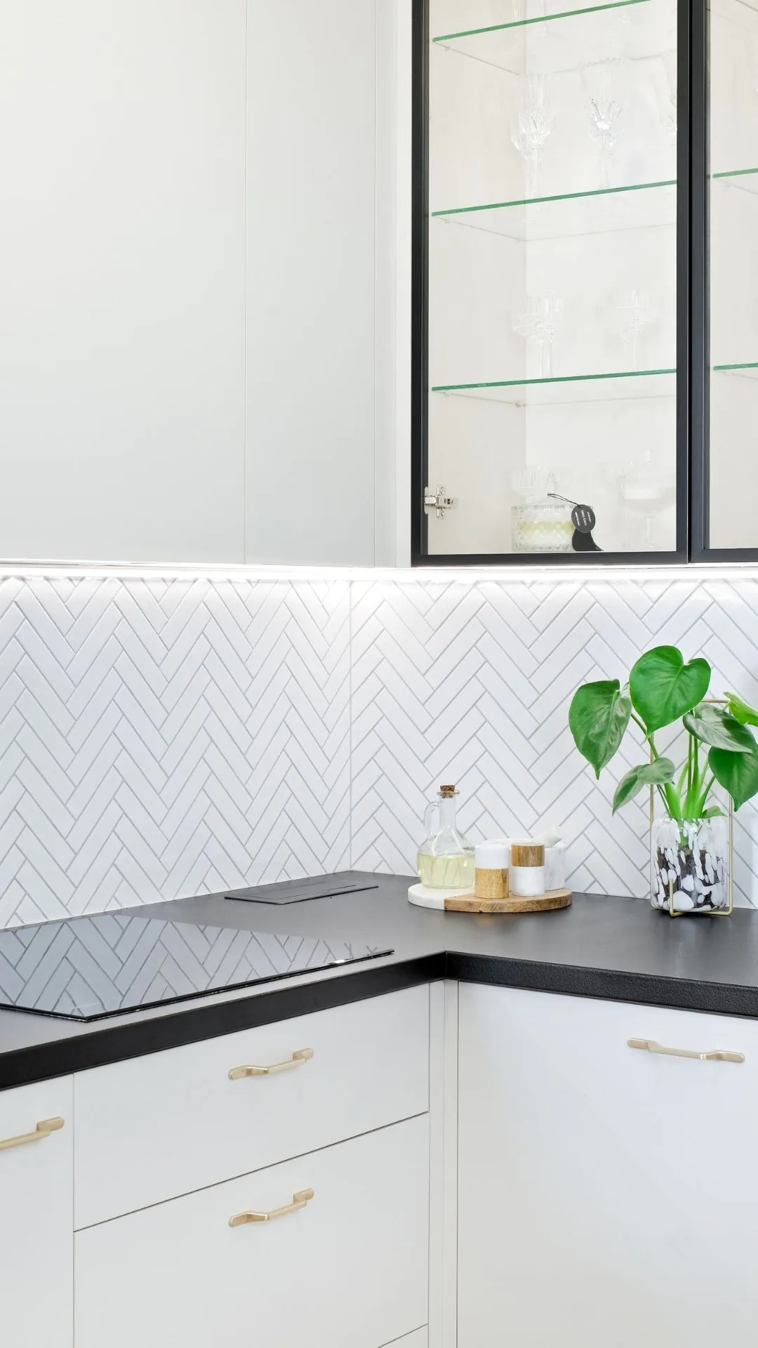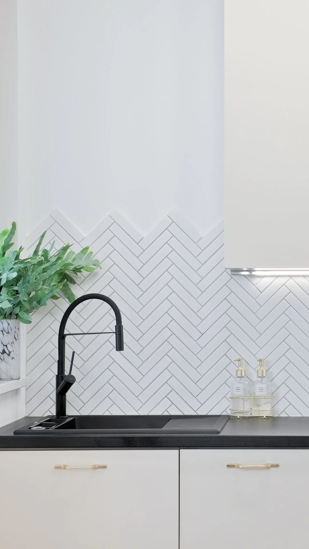 Herringbone este un model îndrăgit de mulți ani și care apare frecvent în amenajările interioare. Plăcile ceramice Herringbone XL Alb Mată sunt răspunsul contemporan la elementele decorative clasice din amenajările interioare. Ca față de perete în bucătărie, vor adăuga eleganță mobilierului alb din bucătărie, cu un strop de aur.
