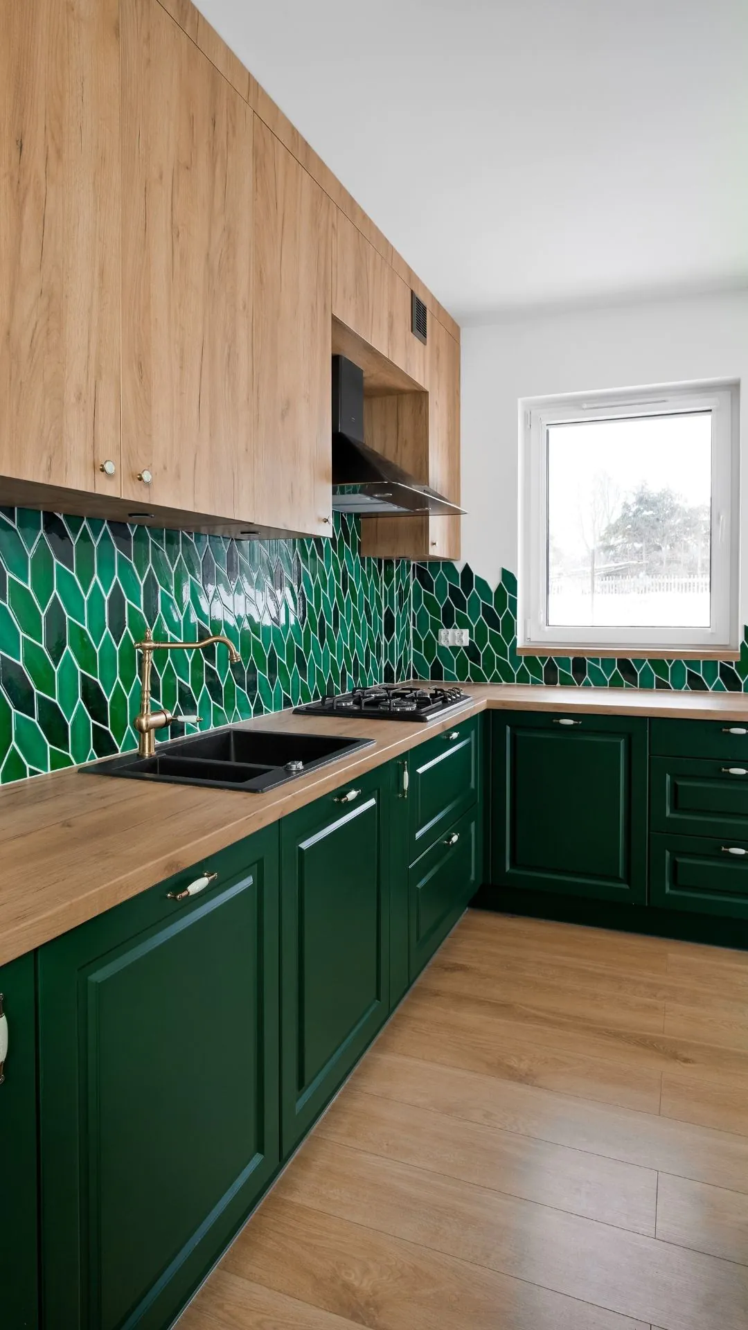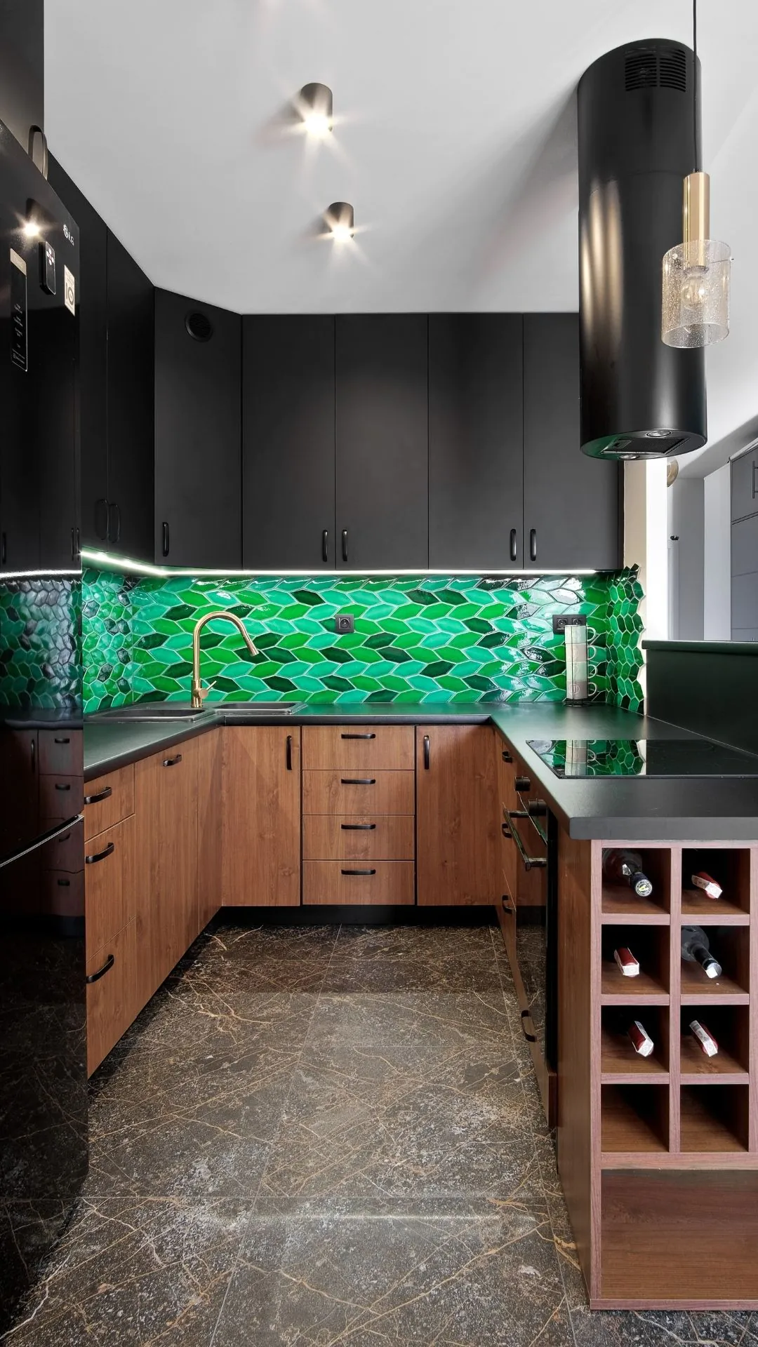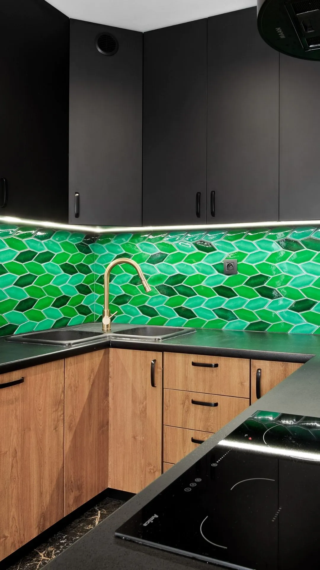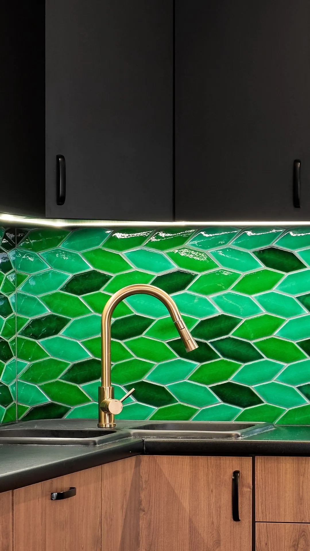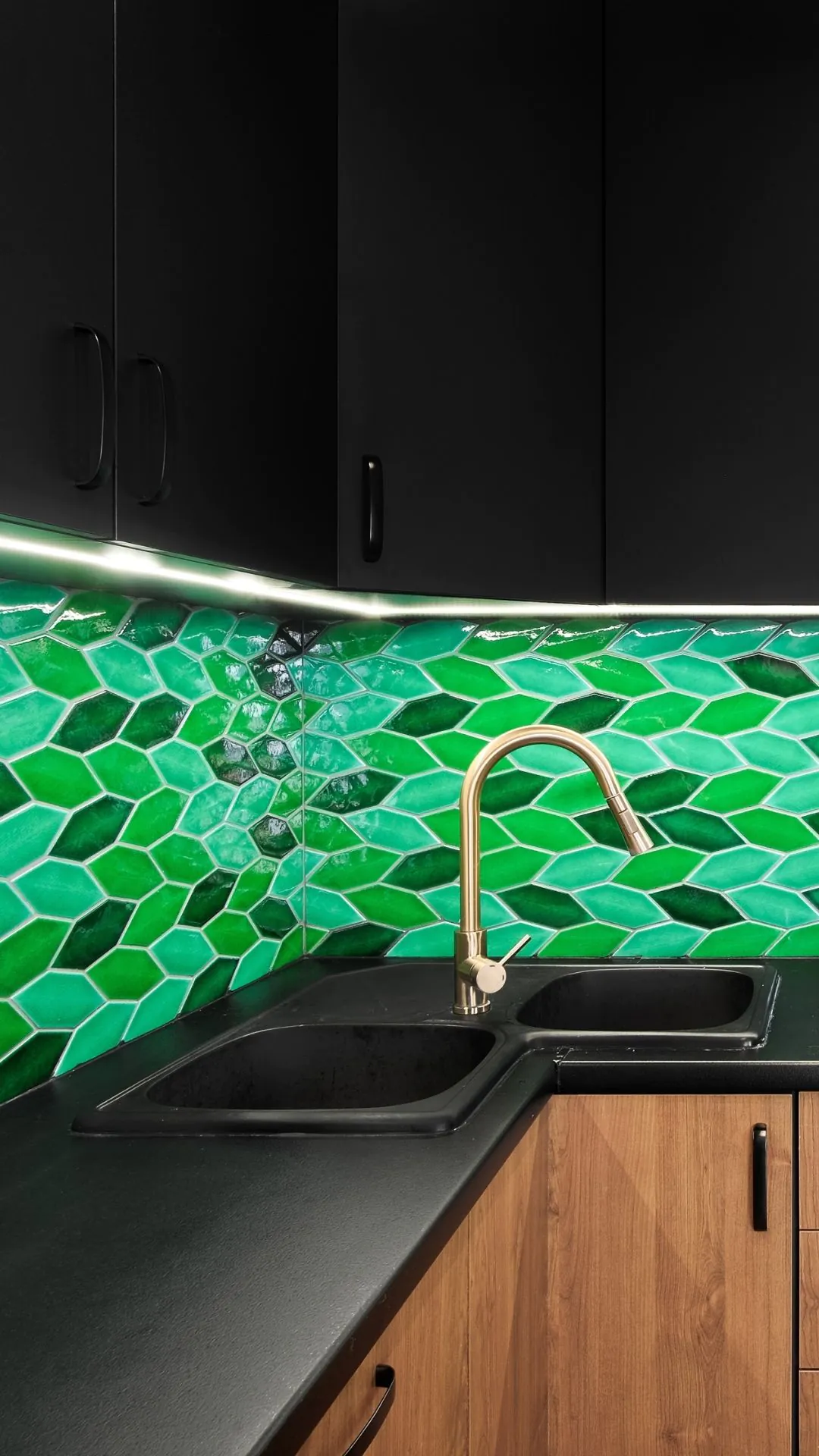 Sub forma plăcilor ceramice Spring Leaves Lucioasă, aceasta este o alegere inspirată! Plăcile verzi suculente se potrivesc perfect cu mobilierul de bucătărie negru și din lemn, iar armatura aurie expusă atrage și mai mult atenția asupra decorului cu frunze.