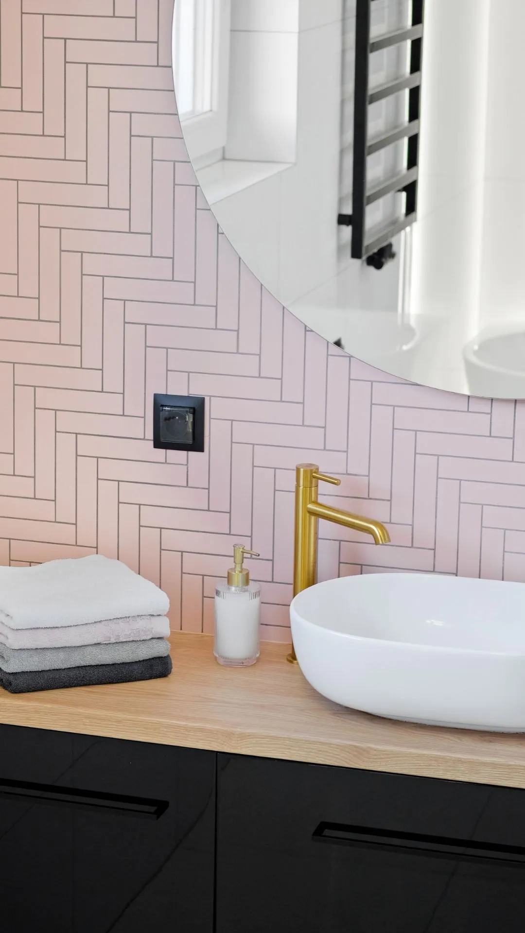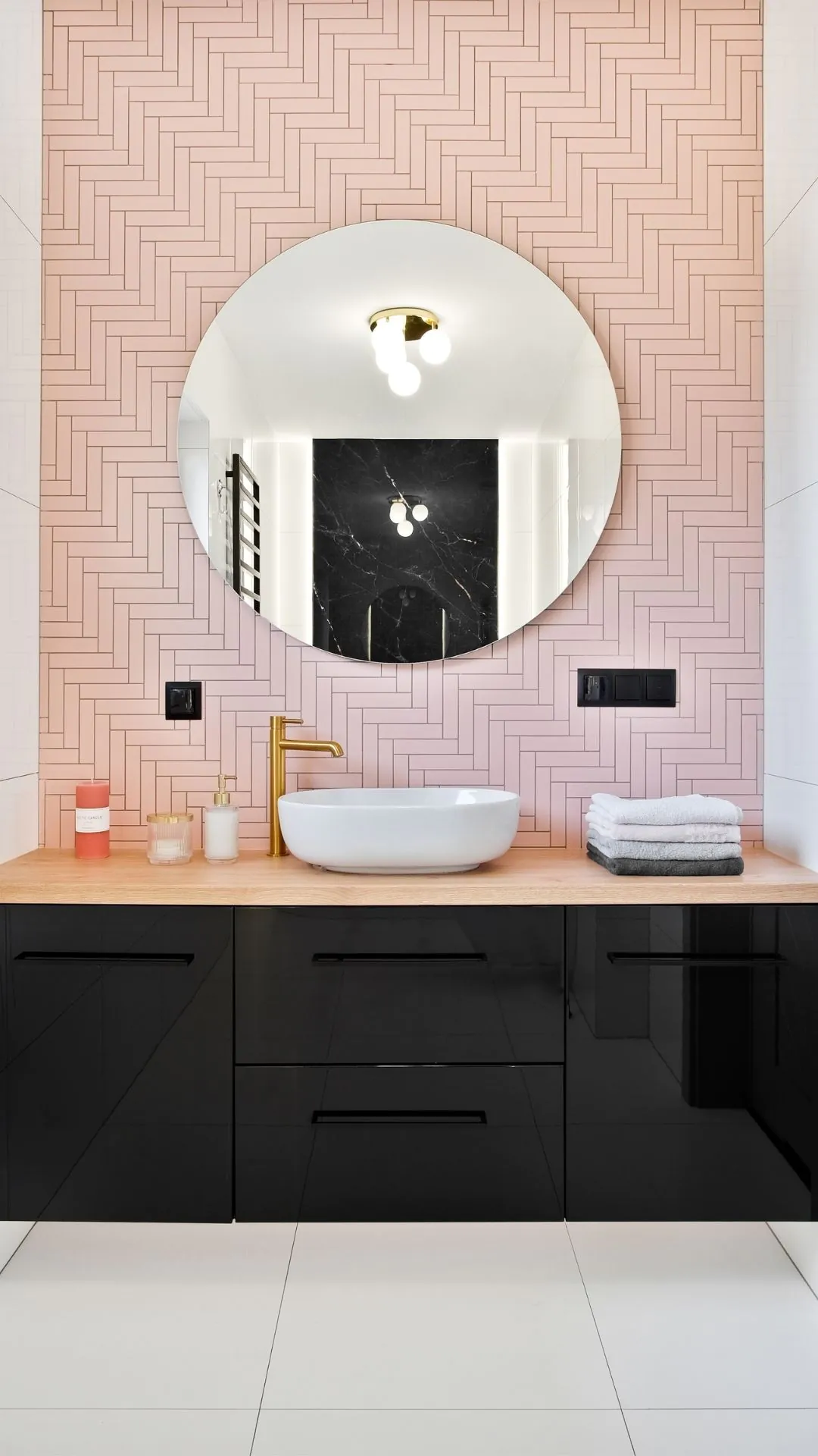 În care eleganța, rozul, negrul și accentele atemporale sub forma mozaicului Herringbone XL Roz Mată se regăsesc, iar la acestea se potrivește perfect armatura aurie.
