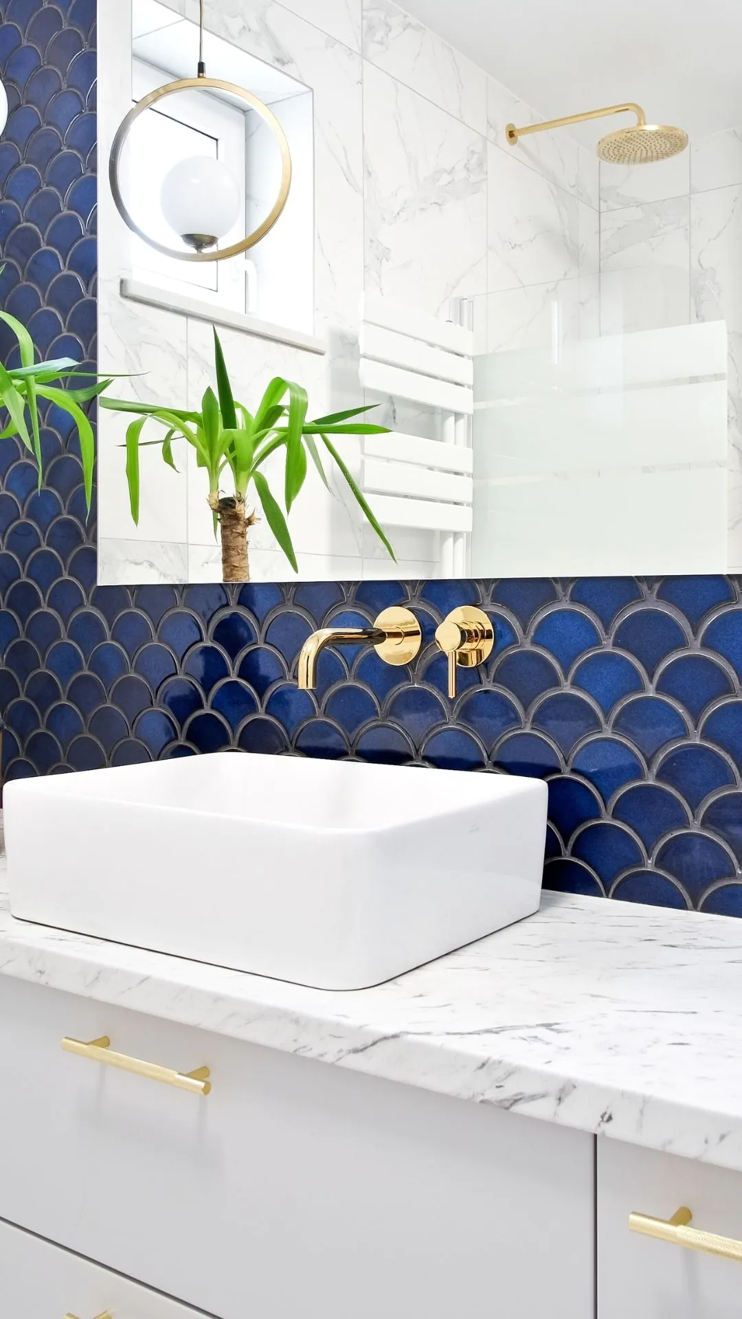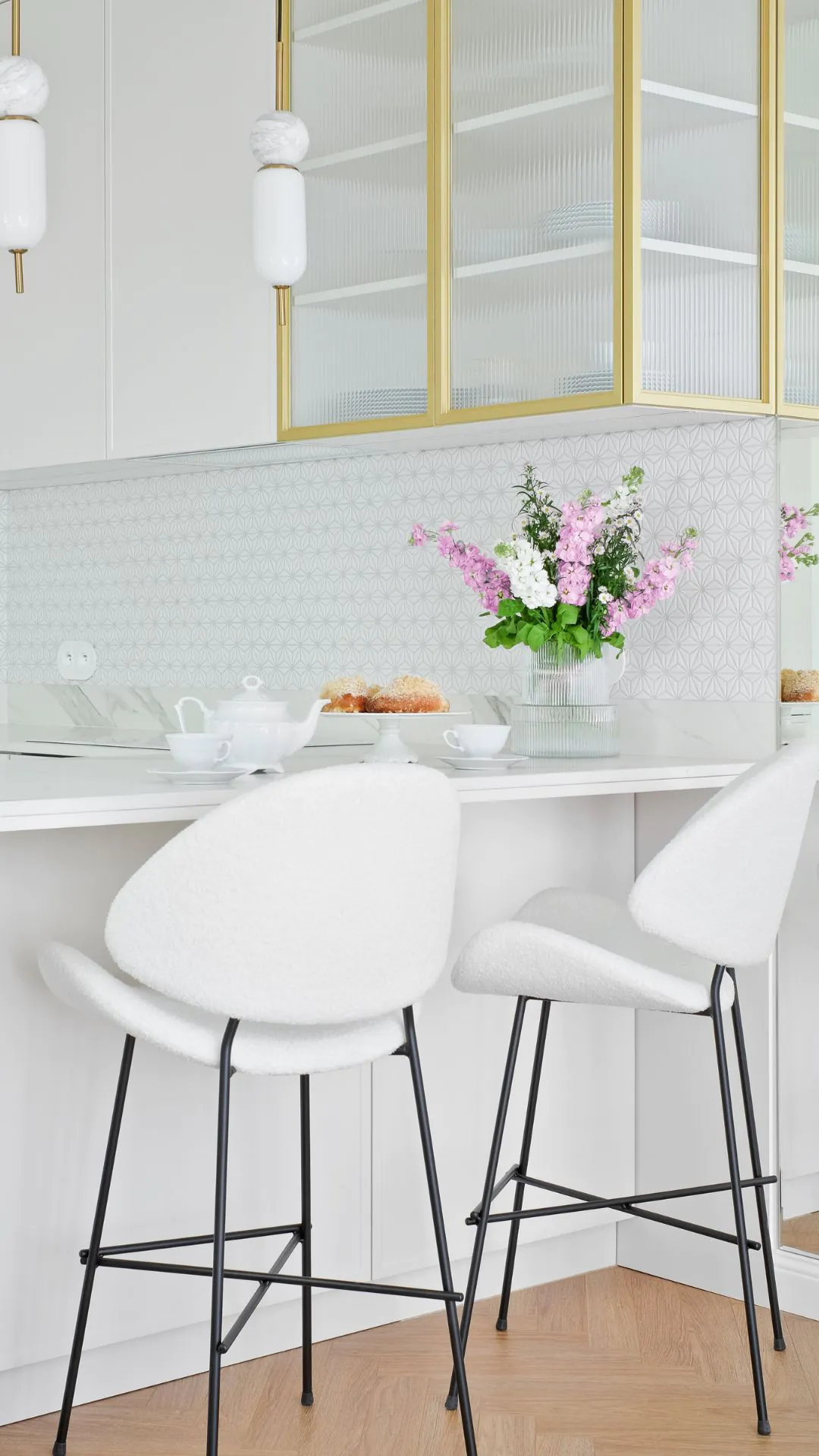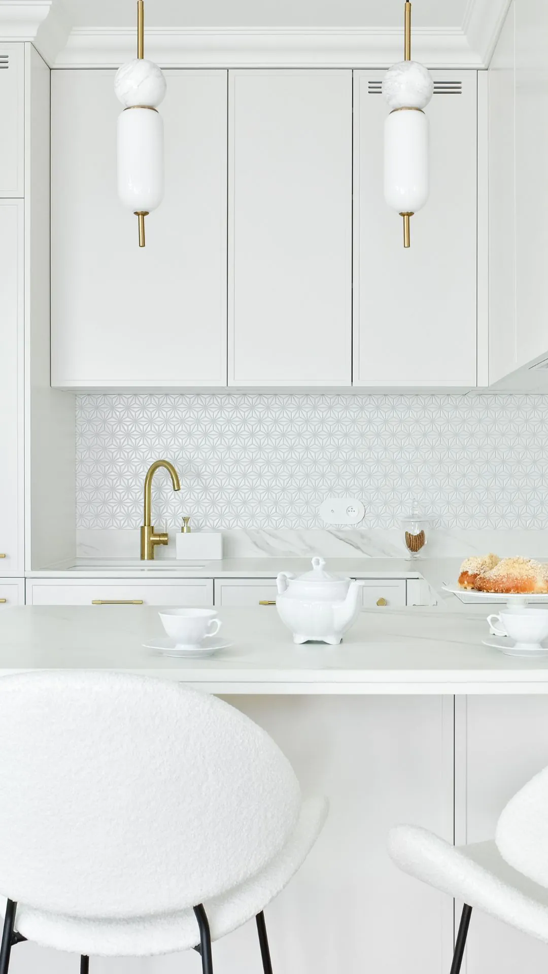 Încântă prin eleganța monocromă, subliniată de mozaicul Constellation White Lucioasă, care decorează peretele. Între acest mozaic lucios și blatul de marmură, a fost integrat un soclu elegant din marmură, adăugând un caracter luxos interiorului. Iluminatul modern, cu detalii aurii și abajururi lungi și ovale din sticlă, împreună cu accesoriile aurii, se combină perfect cu restul decorului, creând un spațiu plin de ușurință și eleganță.