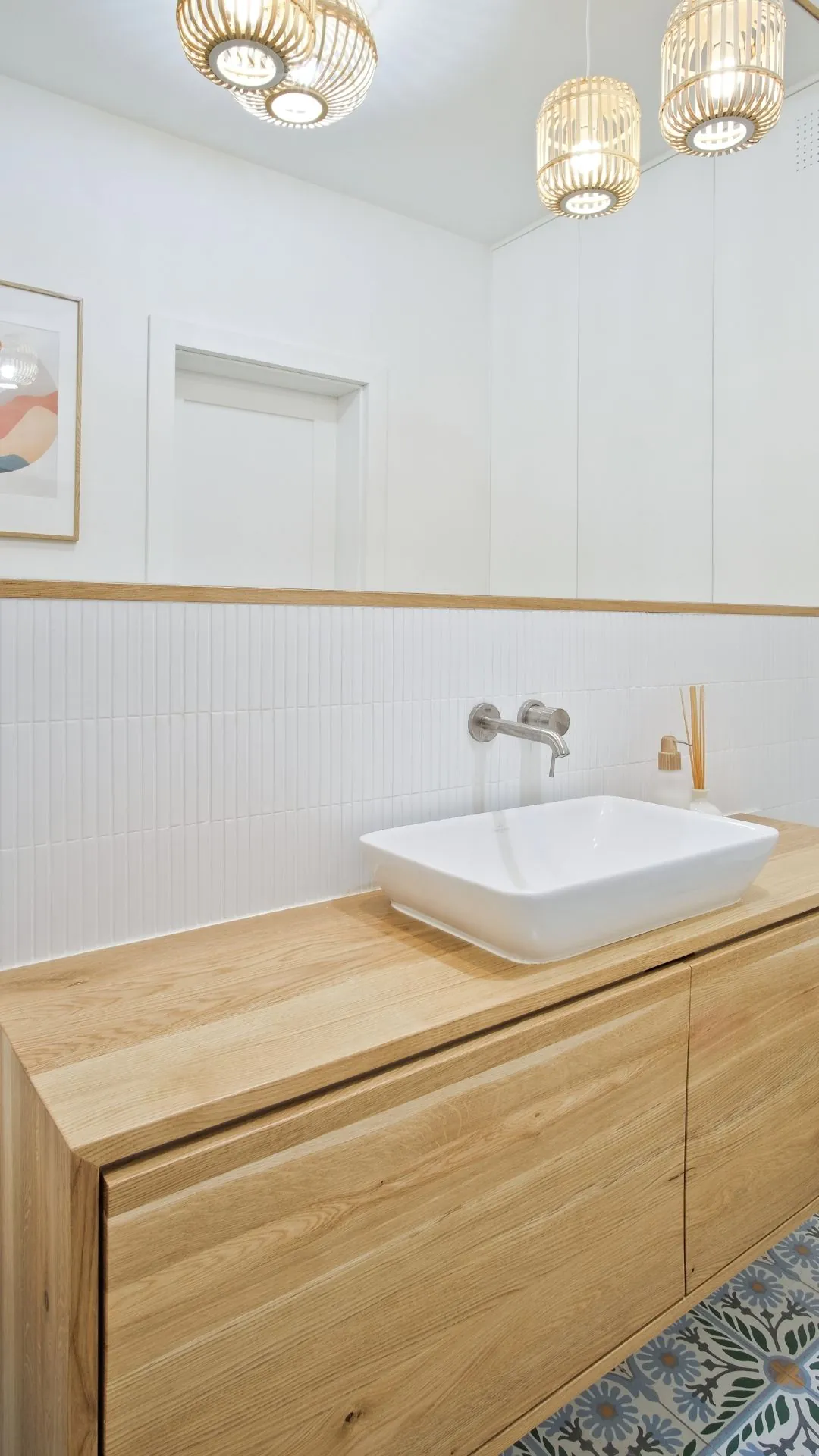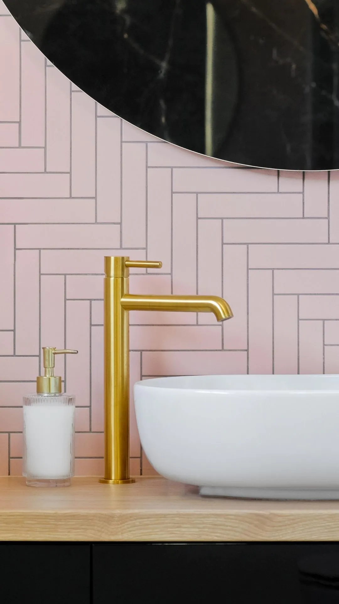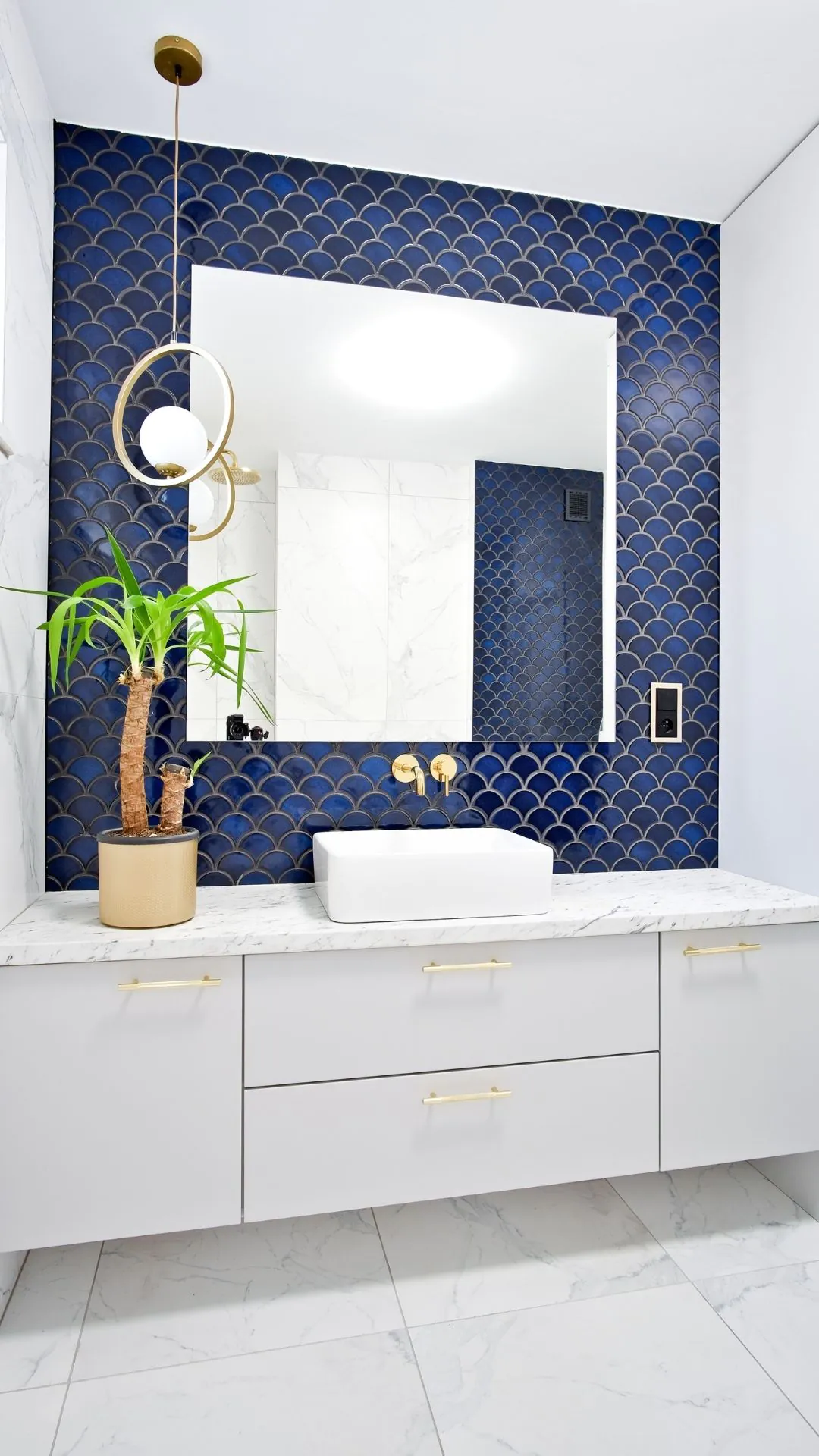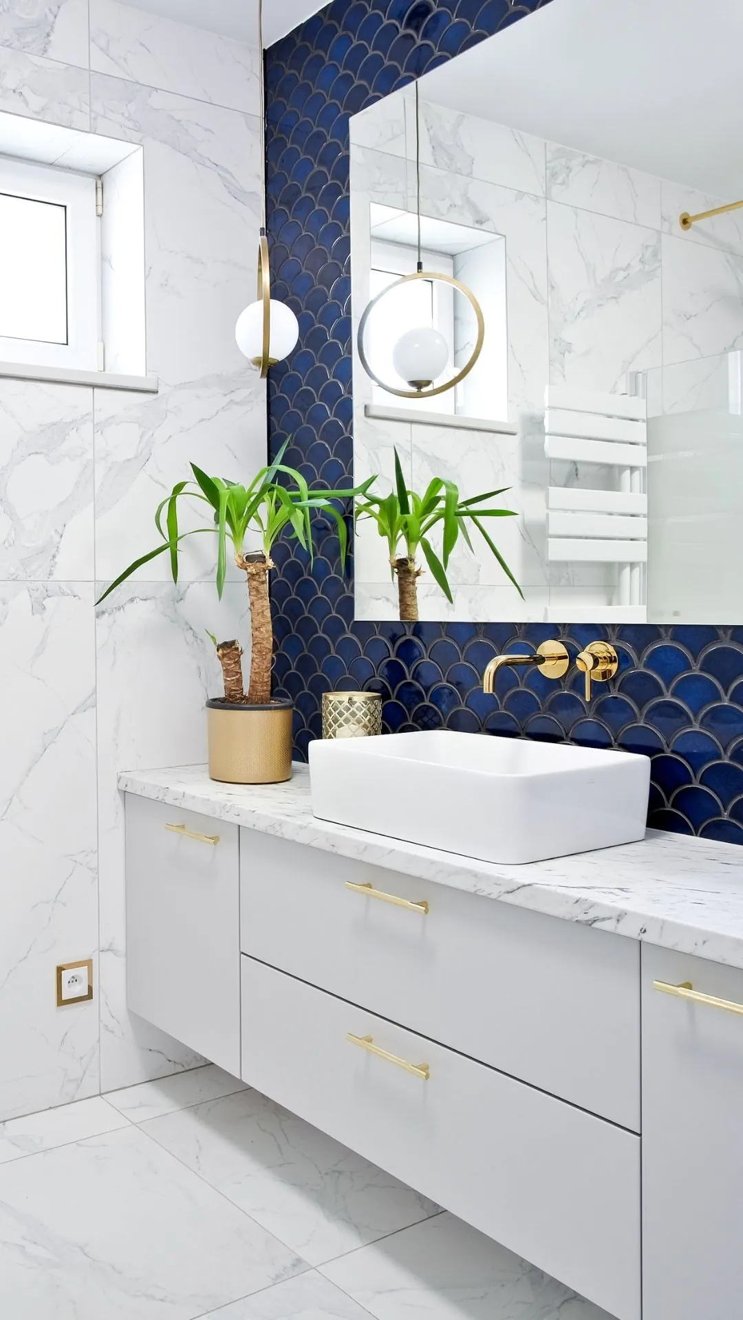 Încântă prin eleganța monocromă, subliniată de mozaicul Constellation White Lucioasă, care decorează peretele. Între acest mozaic lucios și blatul de marmură, a fost integrat un soclu elegant din marmură, adăugând un caracter luxos interiorului. Iluminatul modern, cu detalii aurii și abajururi lungi și ovale din sticlă, împreună cu accesoriile aurii, se combină perfect cu restul decorului, creând un spațiu plin de ușurință și eleganță.
