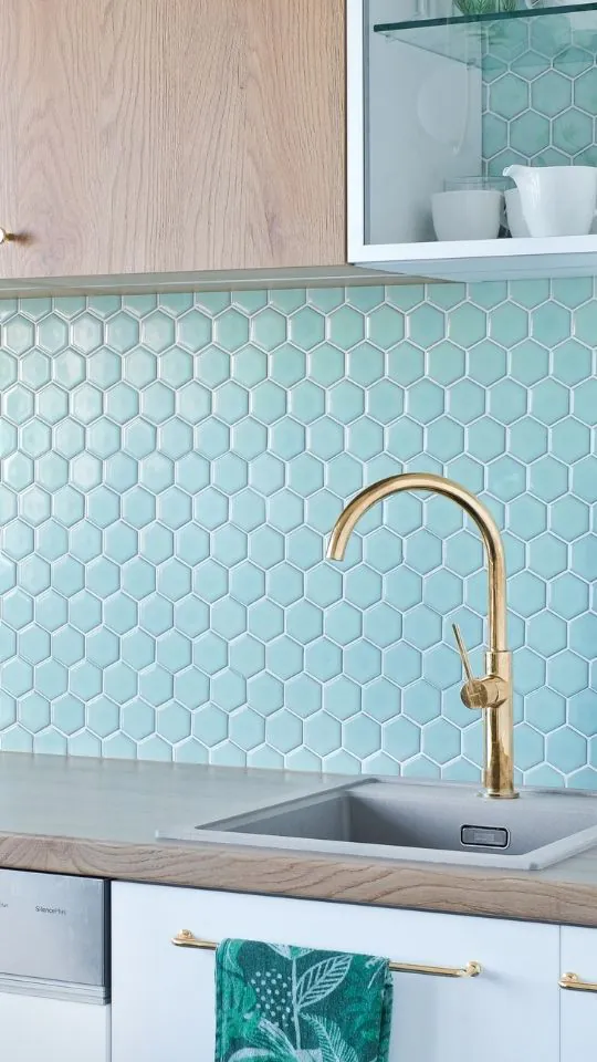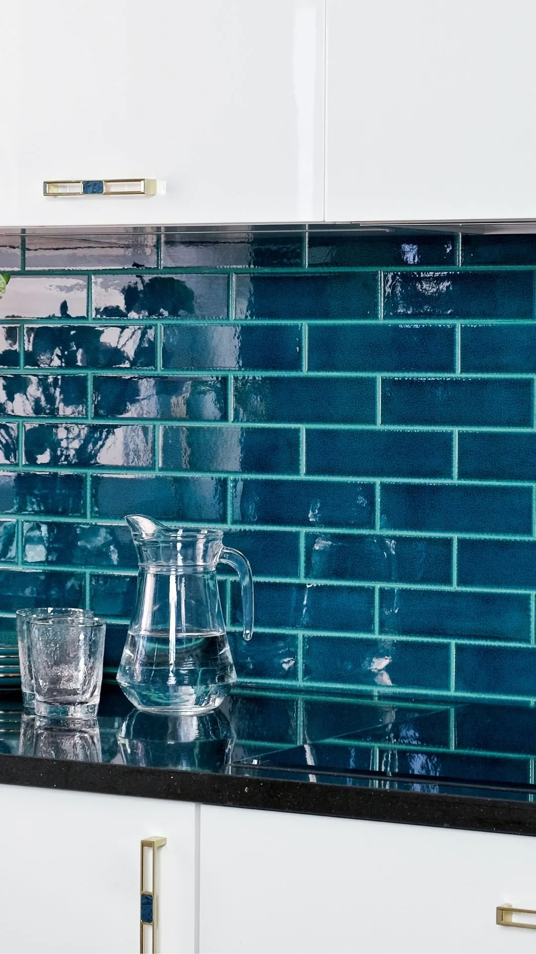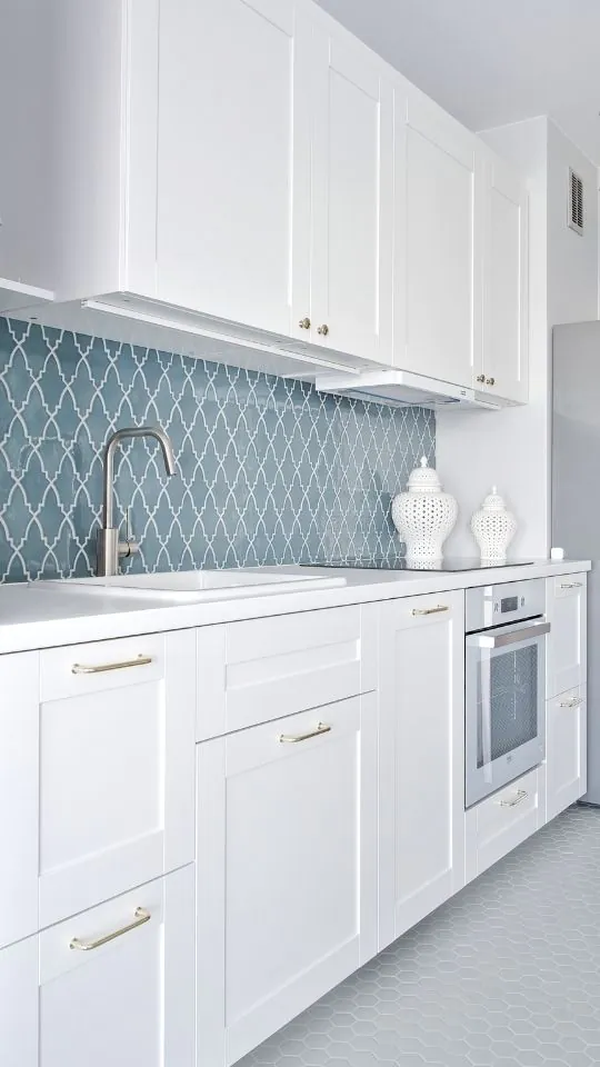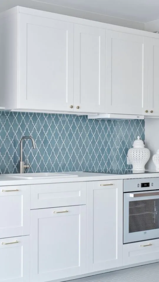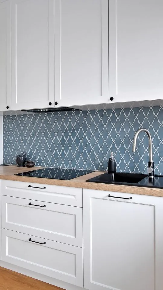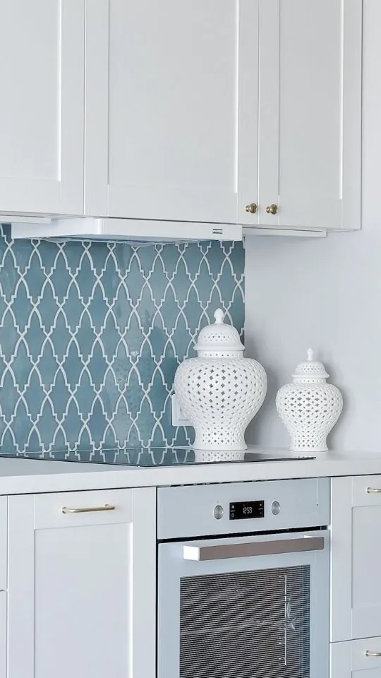 Mozaicul Arabesque Shield Teal Blue Lucioasă nu poate fi doar o parte integrantă a mobilierului de bucătărie și să își prezinte farmecul ca un protector de perete. Turkusul special, fumuriu, care reflectă razele soarelui de la plăcile calibrate, va scoate în evidență eleganța bucătăriei albe cu accente rustice.