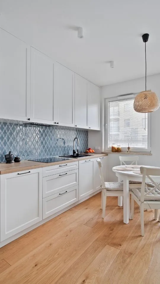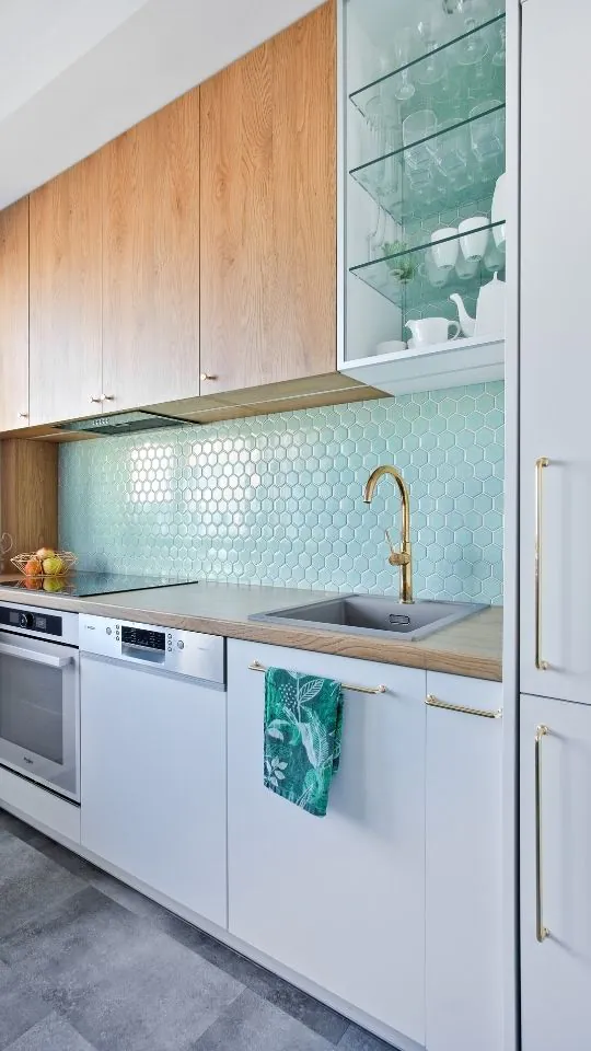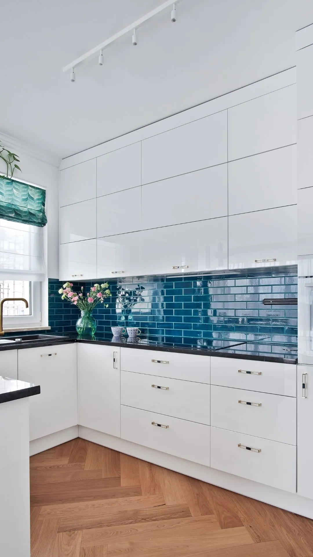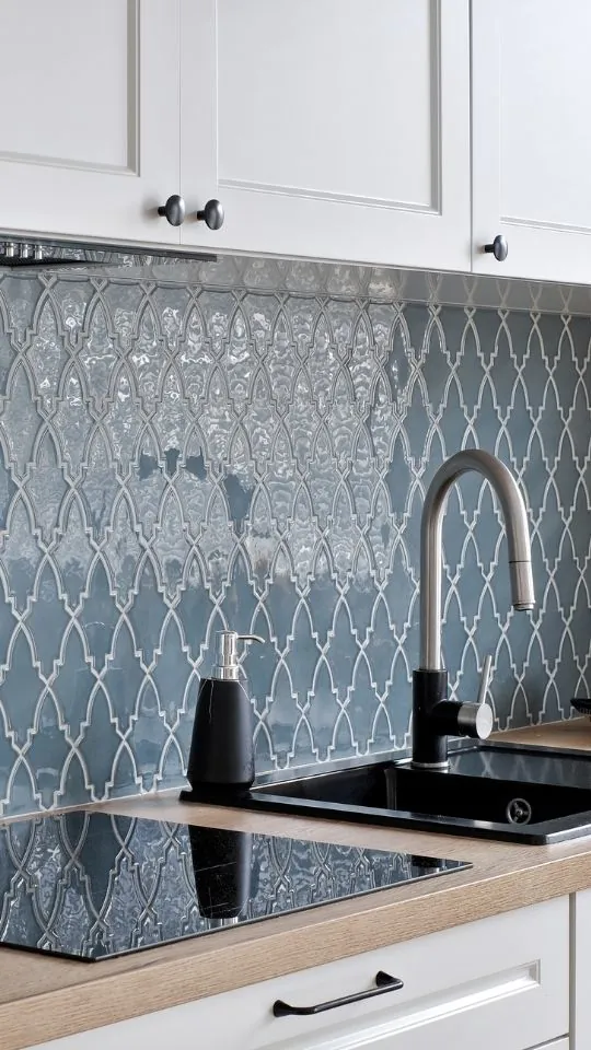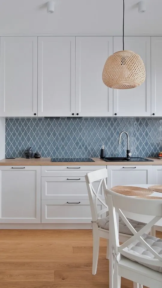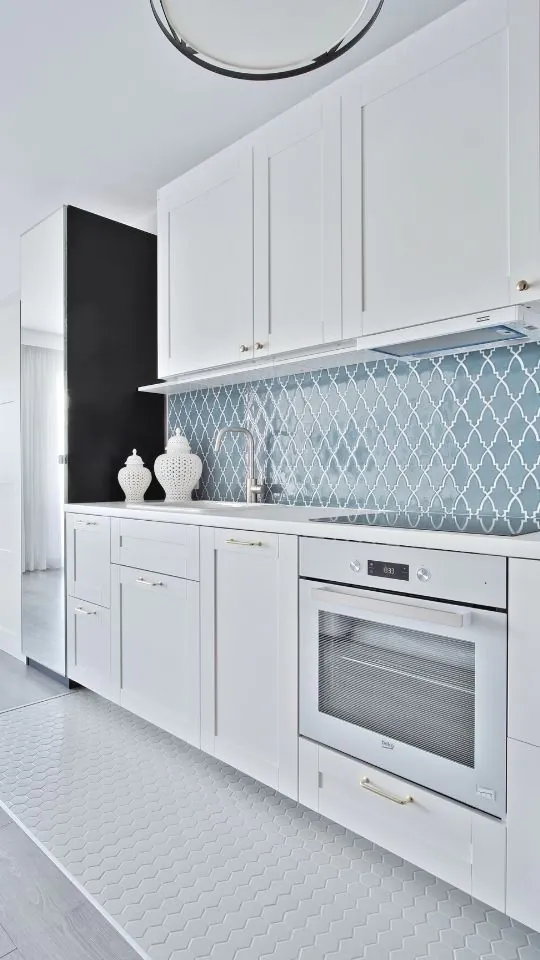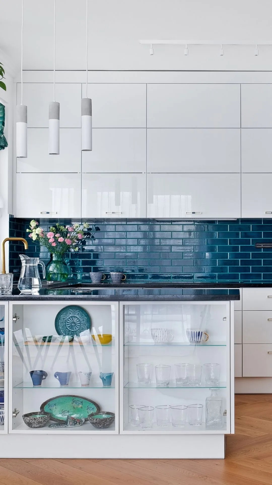 Mozaicul Arabesque Shield Teal Blue Lucioasă nu poate fi doar o parte integrantă a mobilierului de bucătărie și să își prezinte farmecul ca un protector de perete. Turkusul special, fumuriu, care reflectă razele soarelui de la plăcile calibrate, va scoate în evidență eleganța bucătăriei albe cu accente rustice.