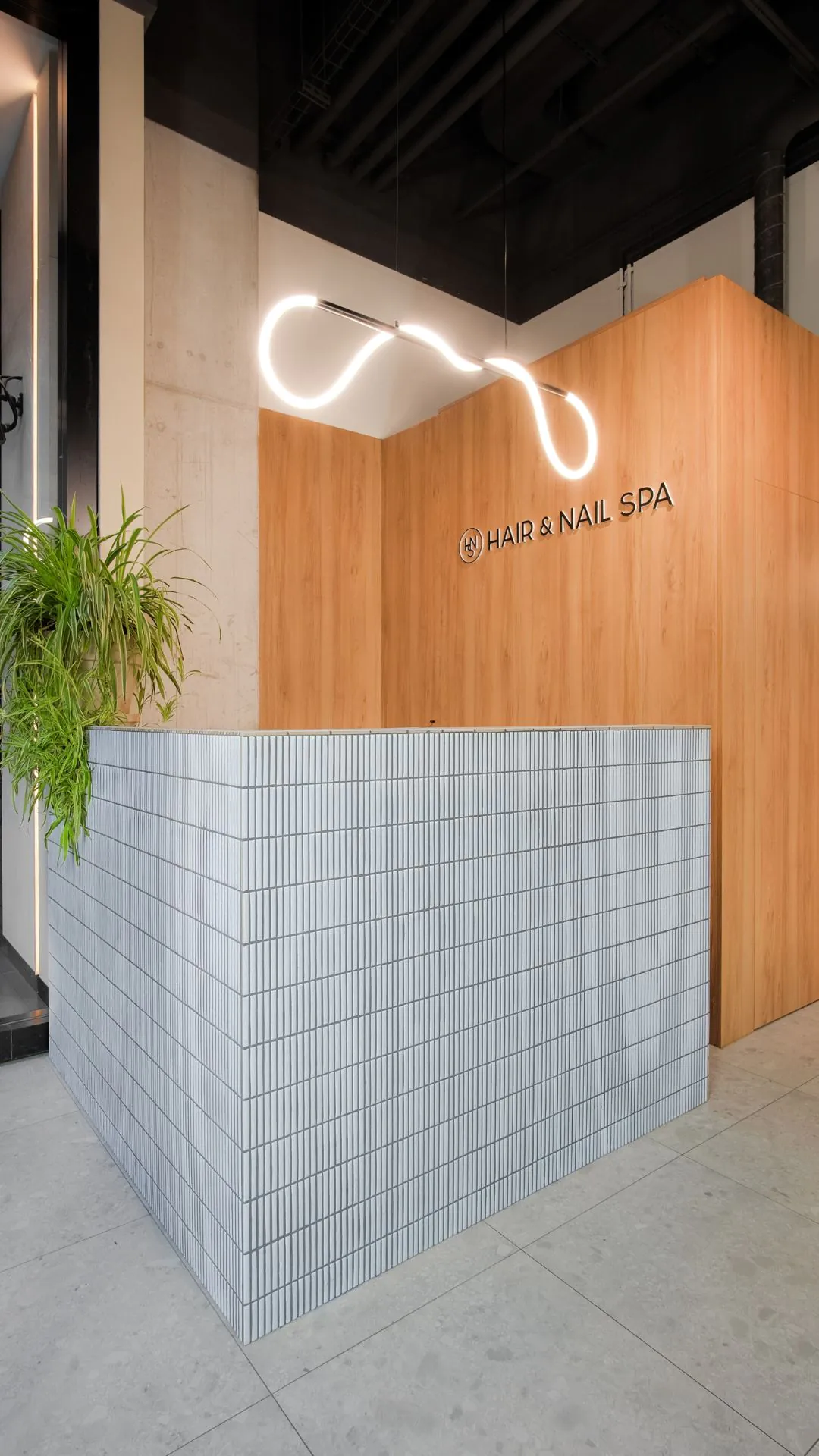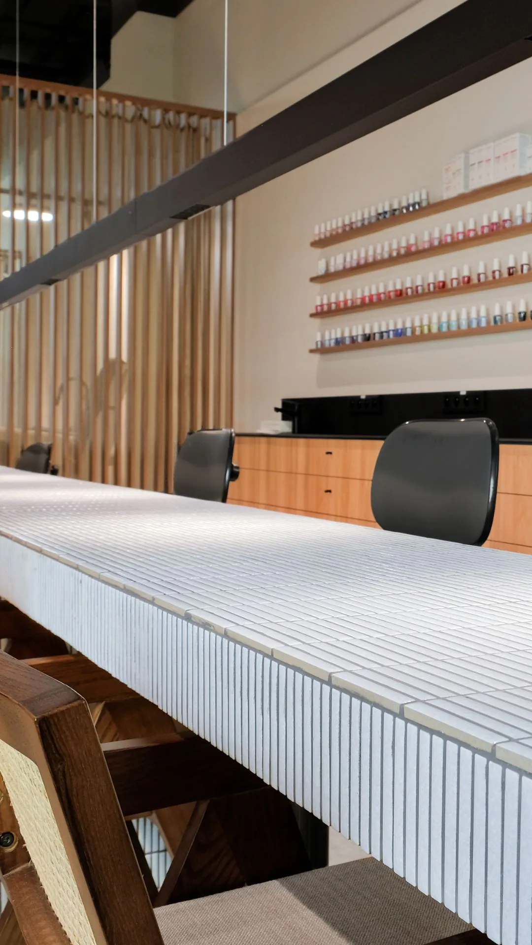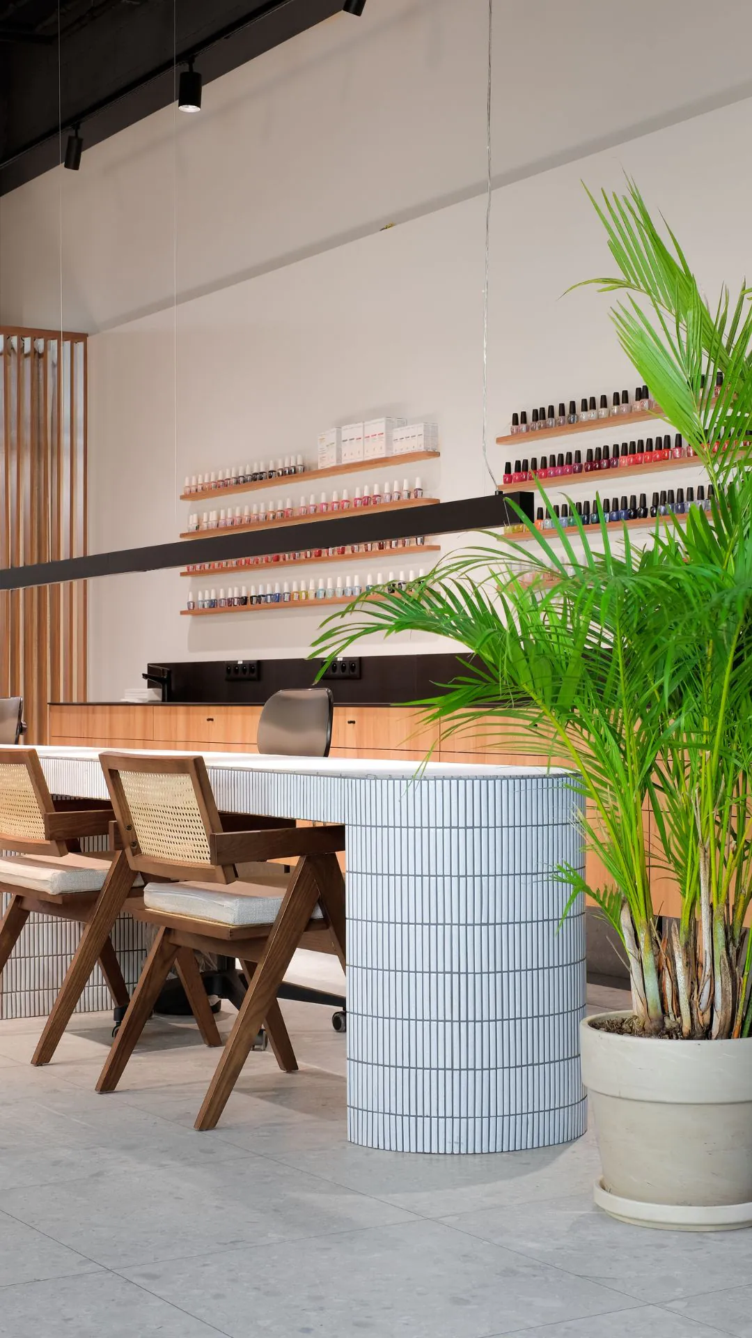 Este un exemplu original și impresionant de utilizare a mozaicului Stick Sky Lucioasă. Masa pentru stilizarea unghiilor și recepția, acoperite cu acest mozaic lucios, au devenit nu doar elemente practice de mobilier, ci mai ales un decor deosebit, care atrage atenția. Alegerea mozaicului Raw Decor subliniază versatilitatea utilizării acestuia, nu doar în case, ci și în locații publice, precum restaurante, cafenele, hoteluri sau saloane de frumusețe.