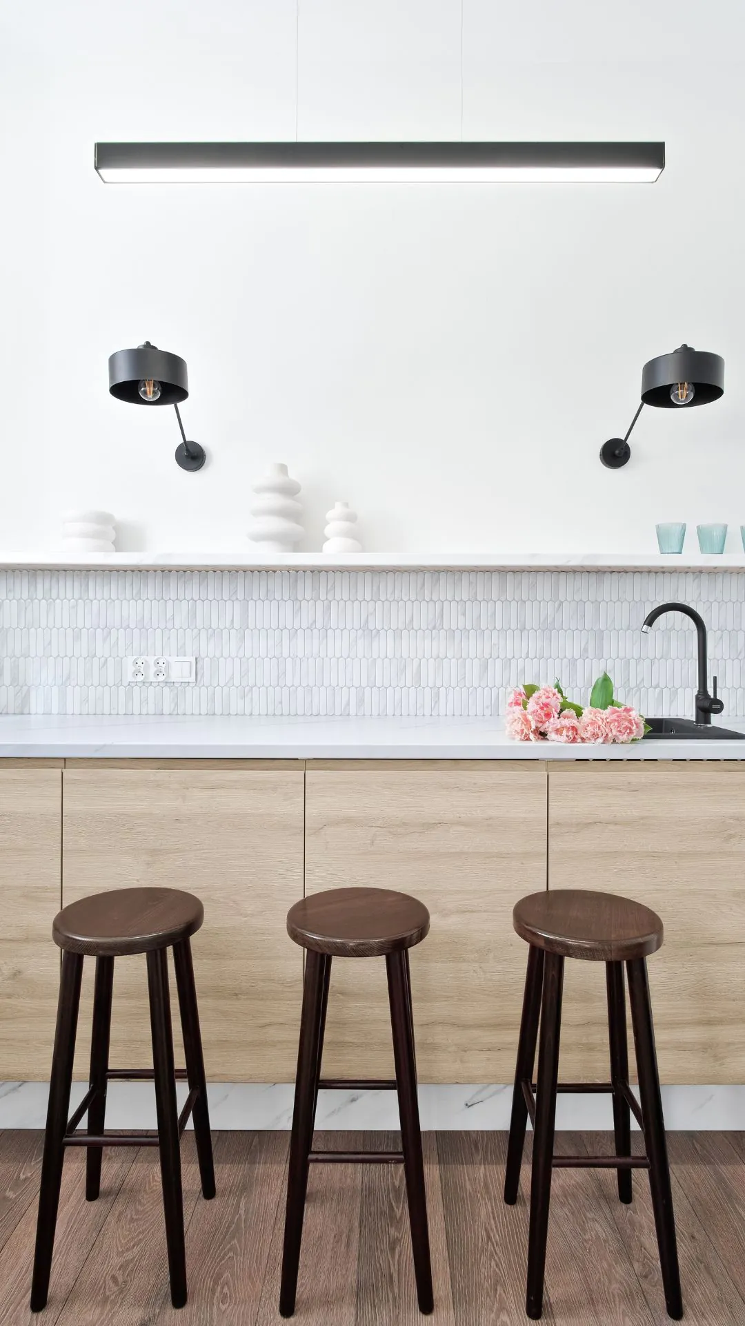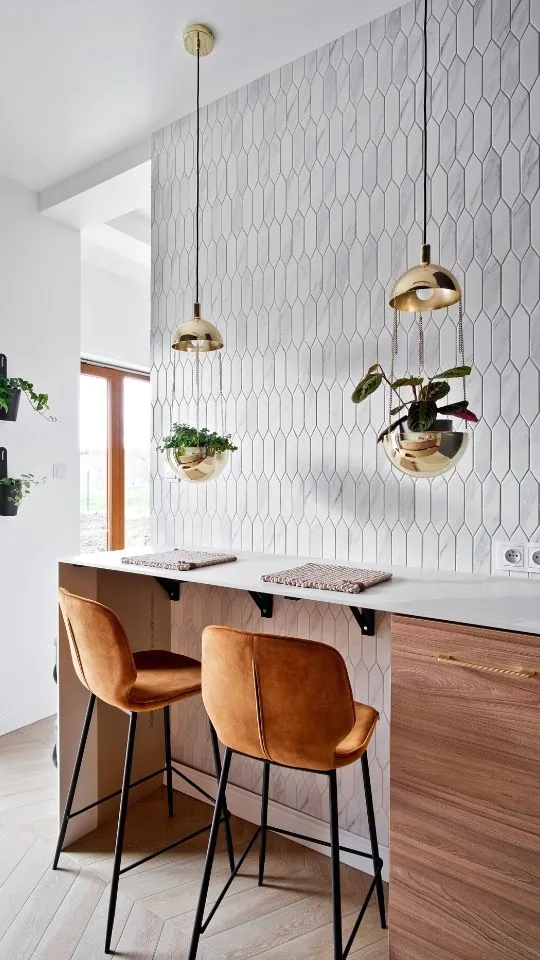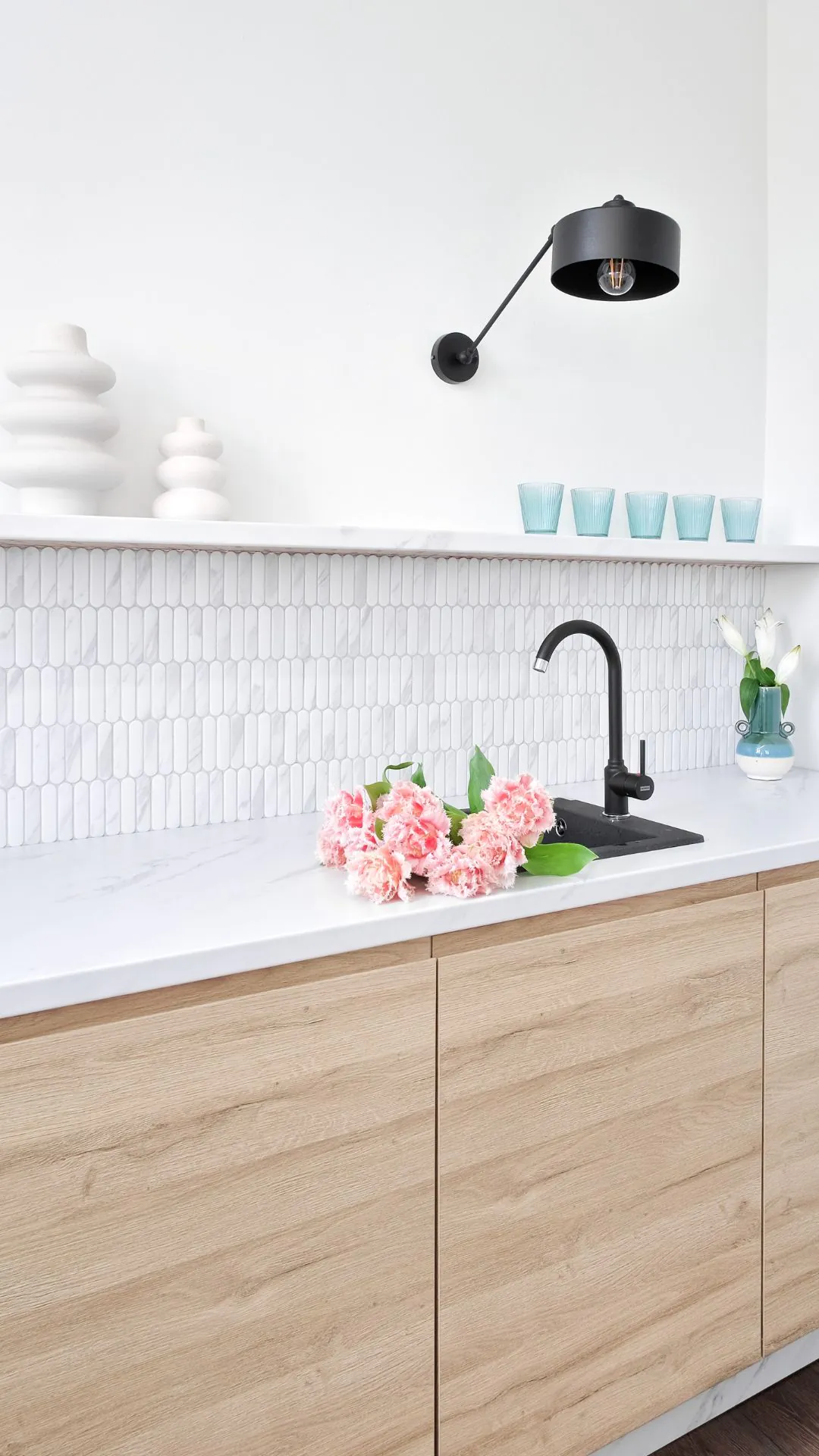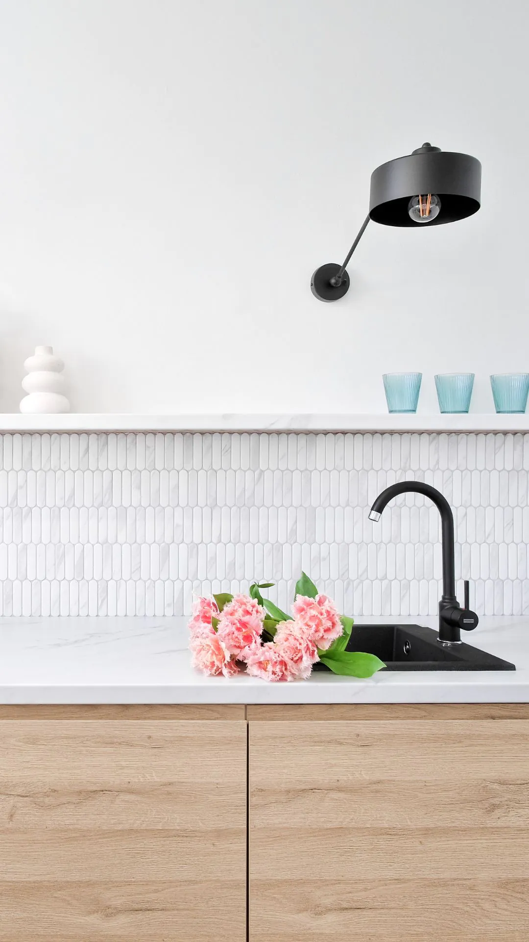 Evidentiază mozaicul rotund Eclair Paris Marble Mată, care înfrumusețează frumos peretele de deasupra blatului. Mai jos, o mică poliță din marmură oferă un loc ideal pentru decorațiuni fermecătoare, creând o compoziție armonioasă cu dulapurile inferioare din lemn natural. Iluminatul industrial, negru, formează un contrast cu delicatețea și eleganța mozaicului, scoțând în evidență caracterul său unic și adăugând un farmec deosebit spațiului.
