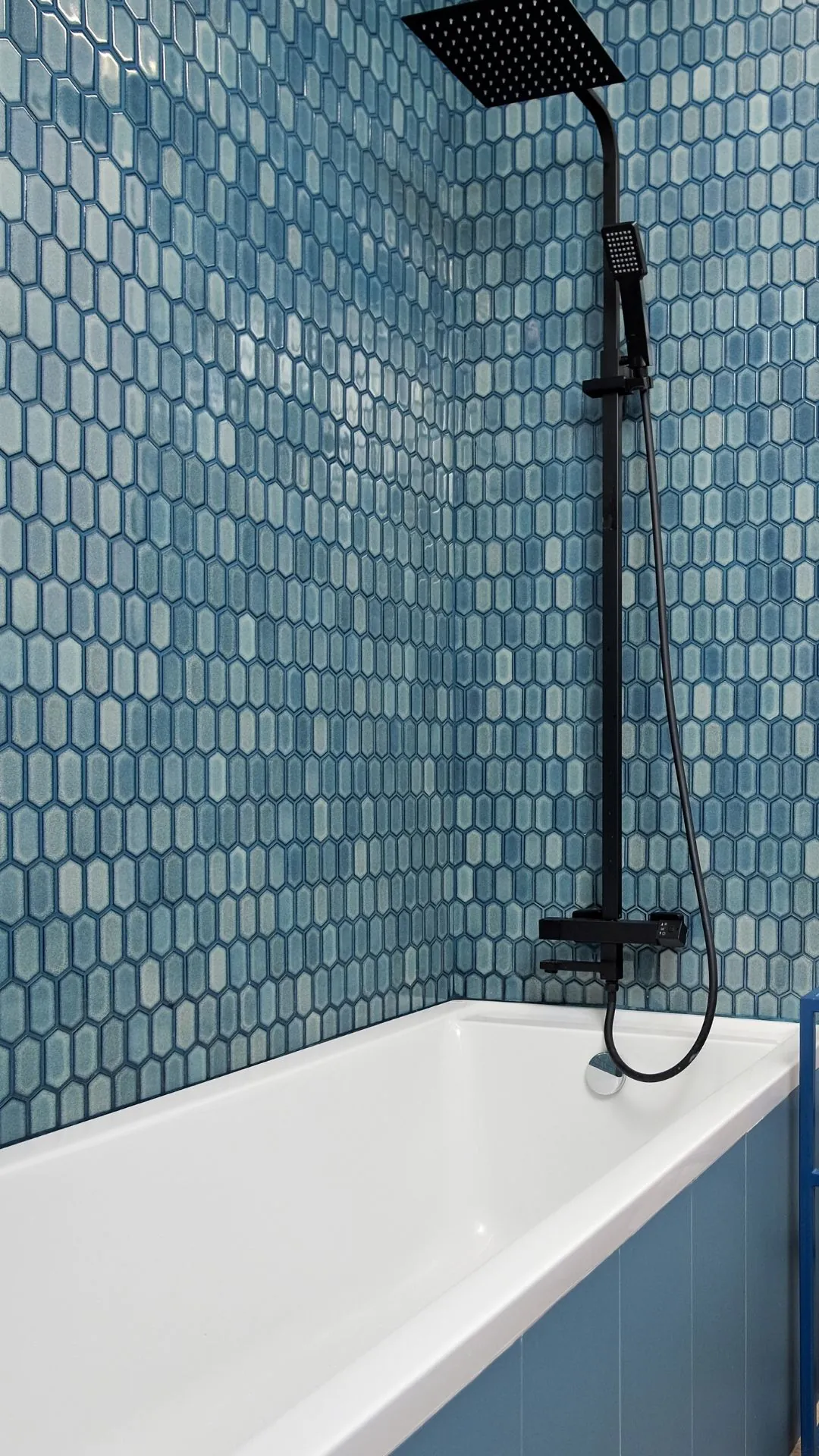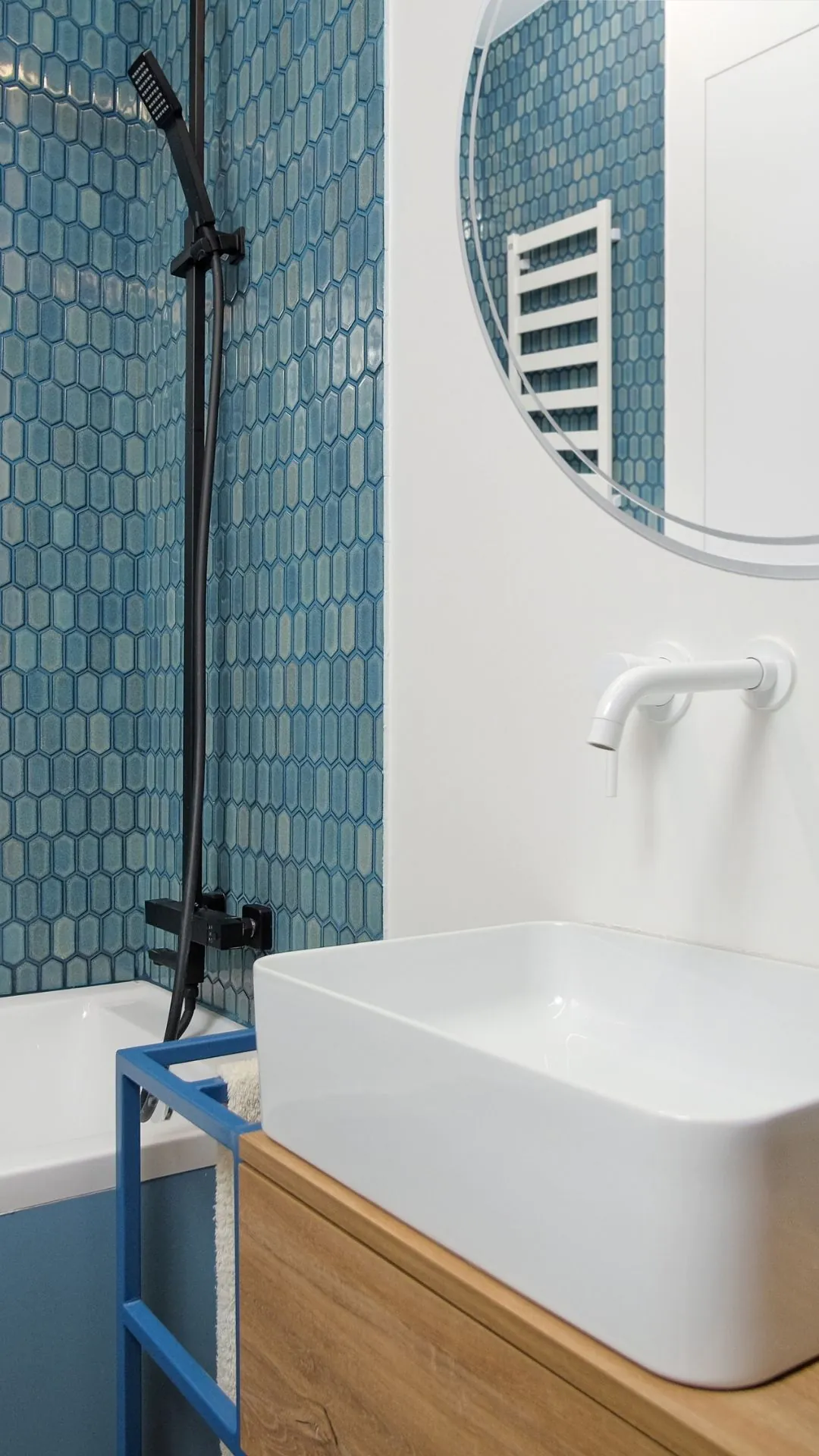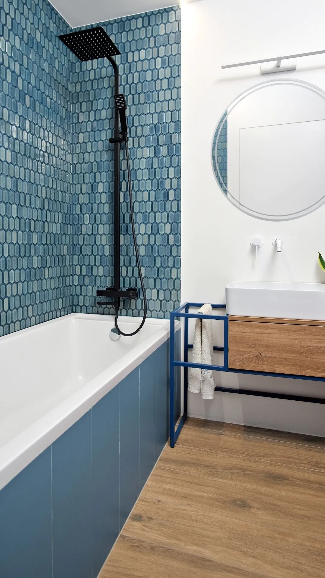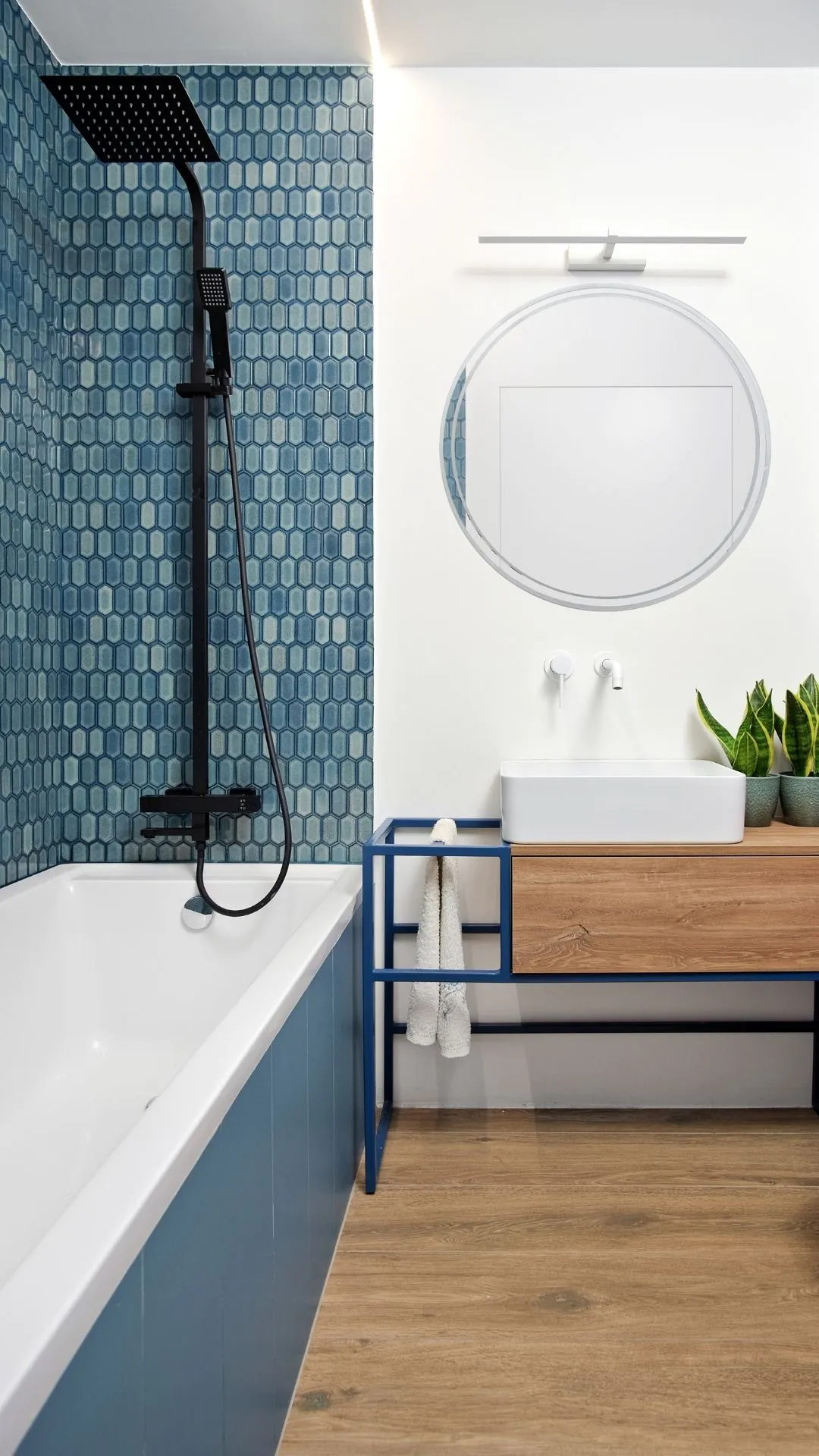 Zona umedă din baie este un loc care merită să fie evidențiat. Mozaicul Heksalong Adriatic Mată, cu adâncimea sa deosebită a nuanțelor de albastru, asemănător cu o masă de apă căzând, învăluie suprafața peretelui de deasupra căzii, contrastând perfect cu zona uscată albă și din lemn.