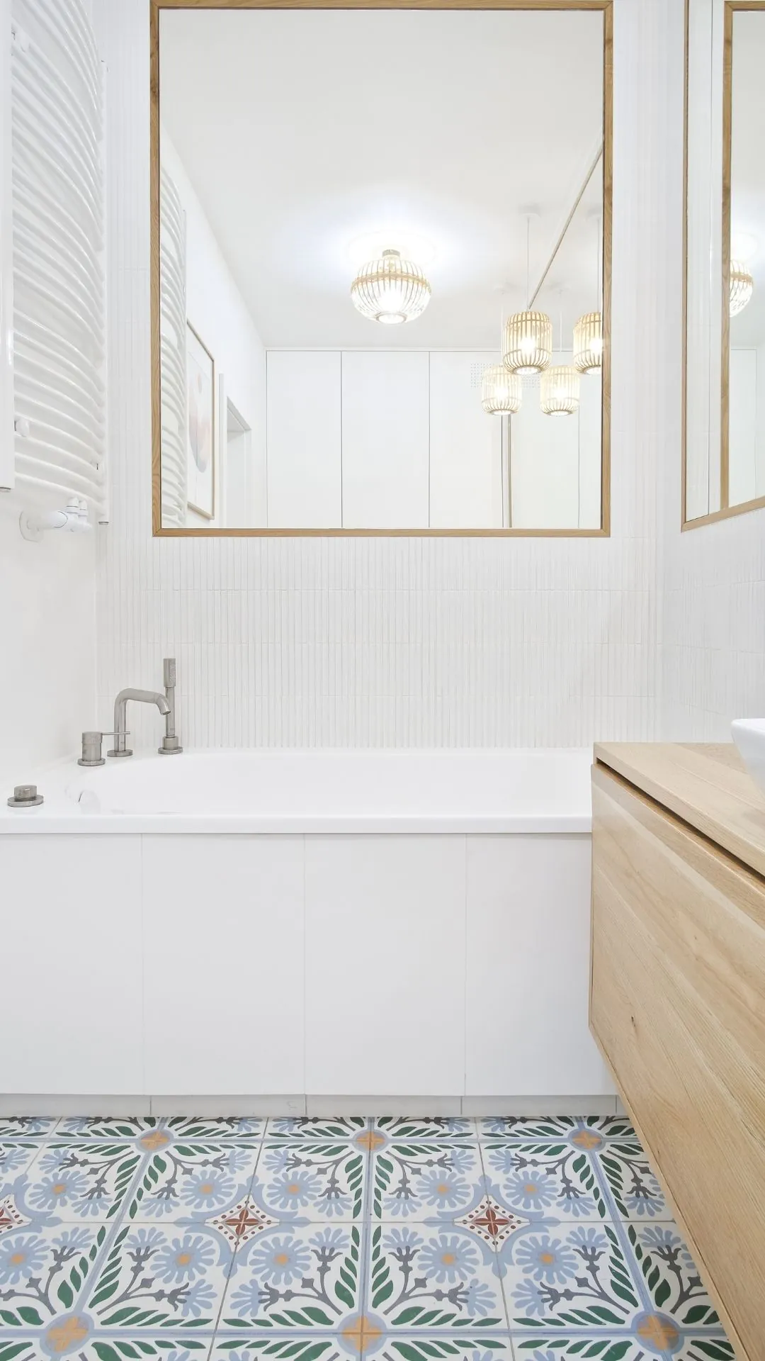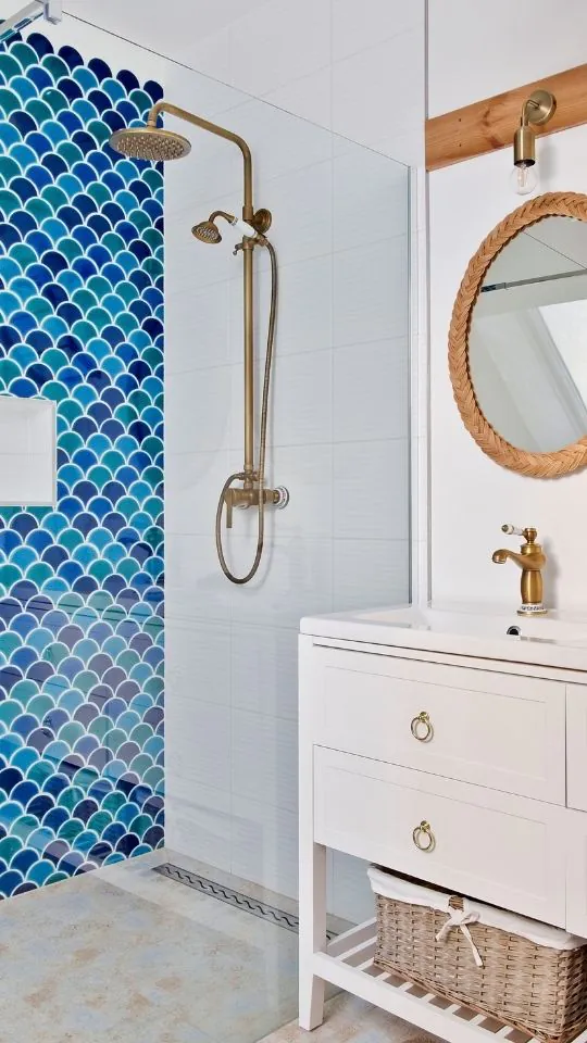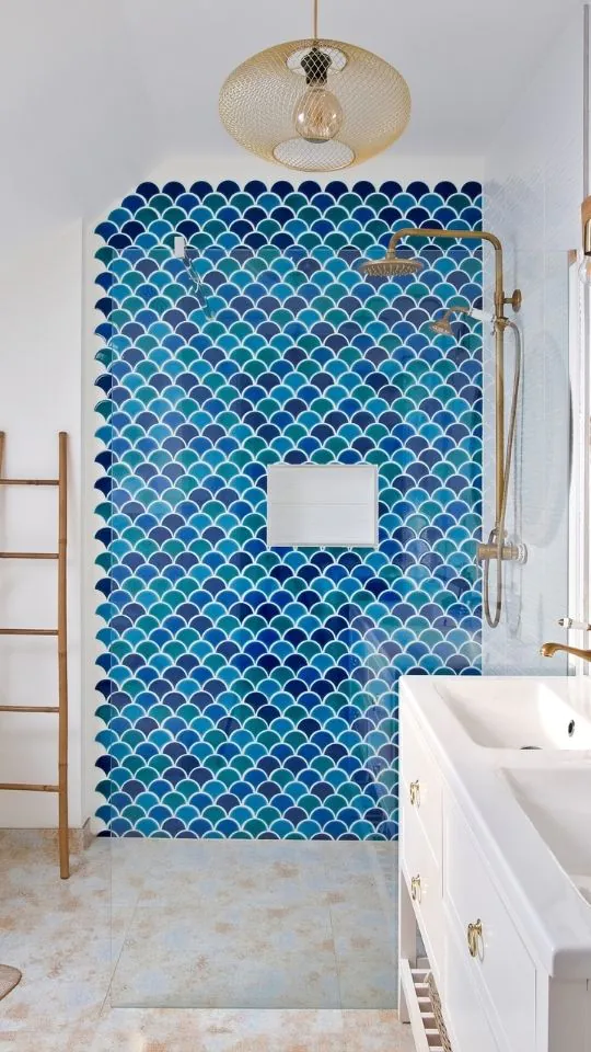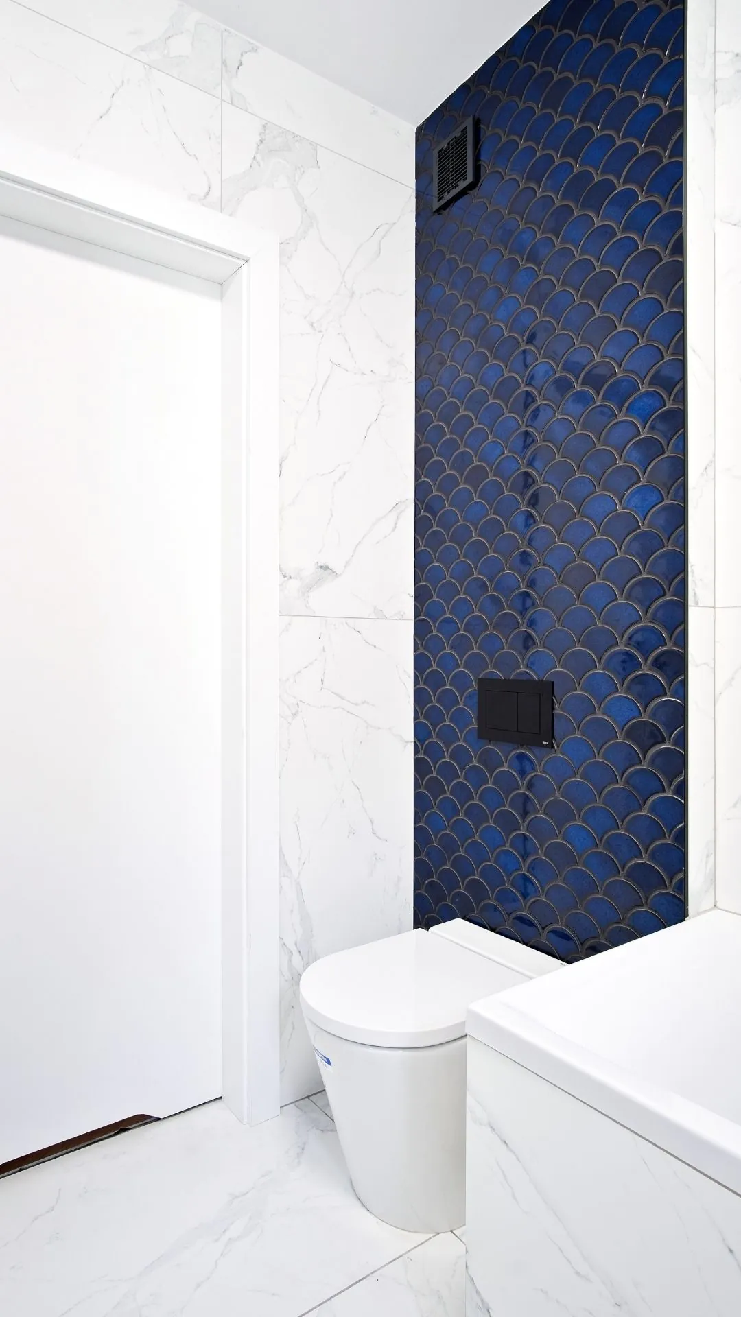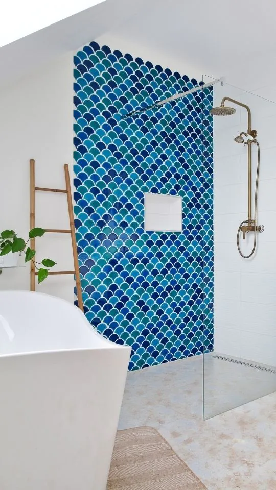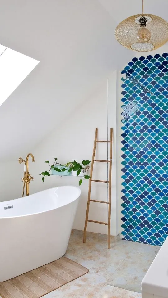 Zona umedă din baie este un loc care merită să fie evidențiat. Mozaicul Heksalong Adriatic Mată, cu adâncimea sa deosebită a nuanțelor de albastru, asemănător cu o masă de apă căzând, învăluie suprafața peretelui de deasupra căzii, contrastând perfect cu zona uscată albă și din lemn.