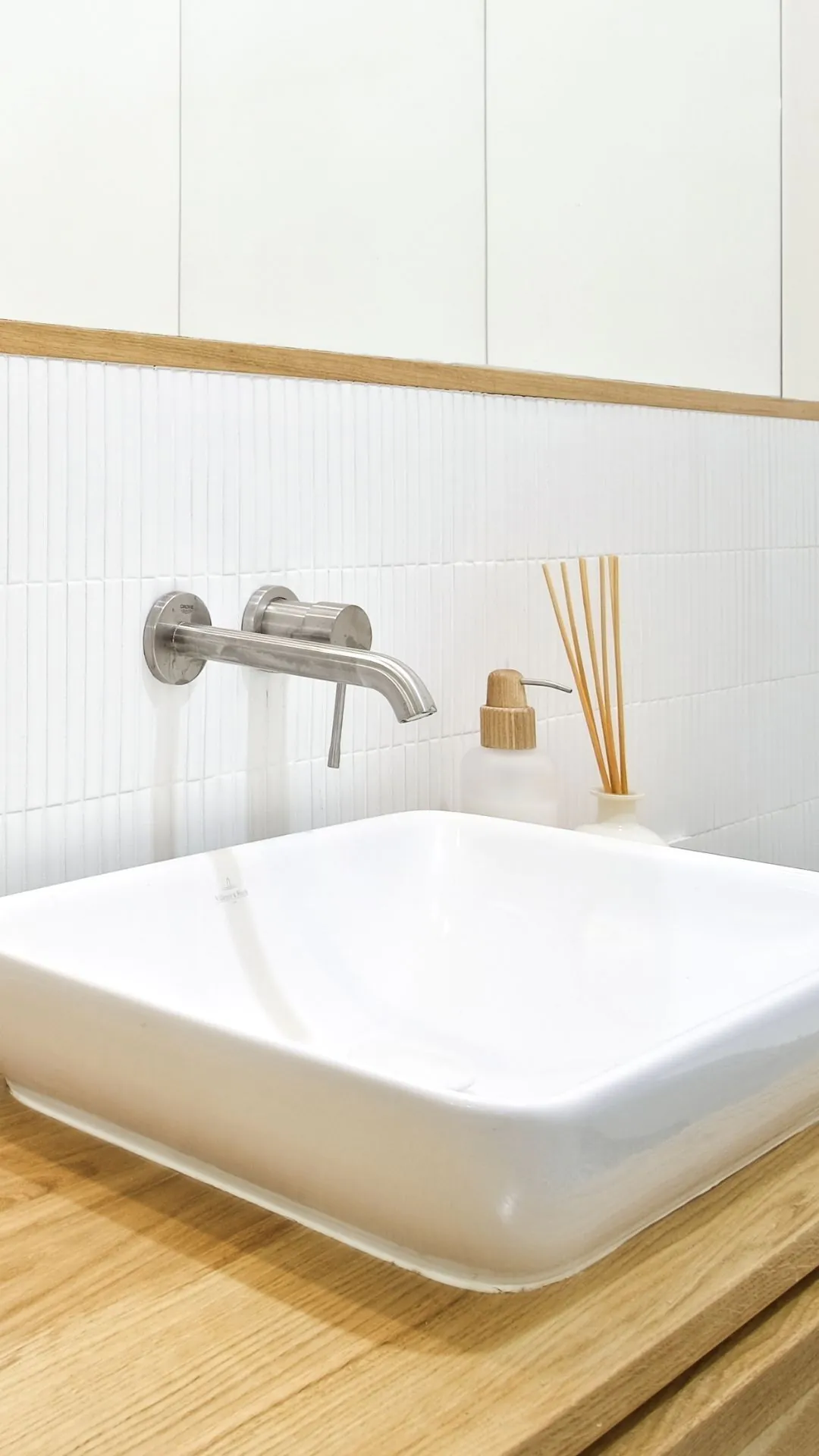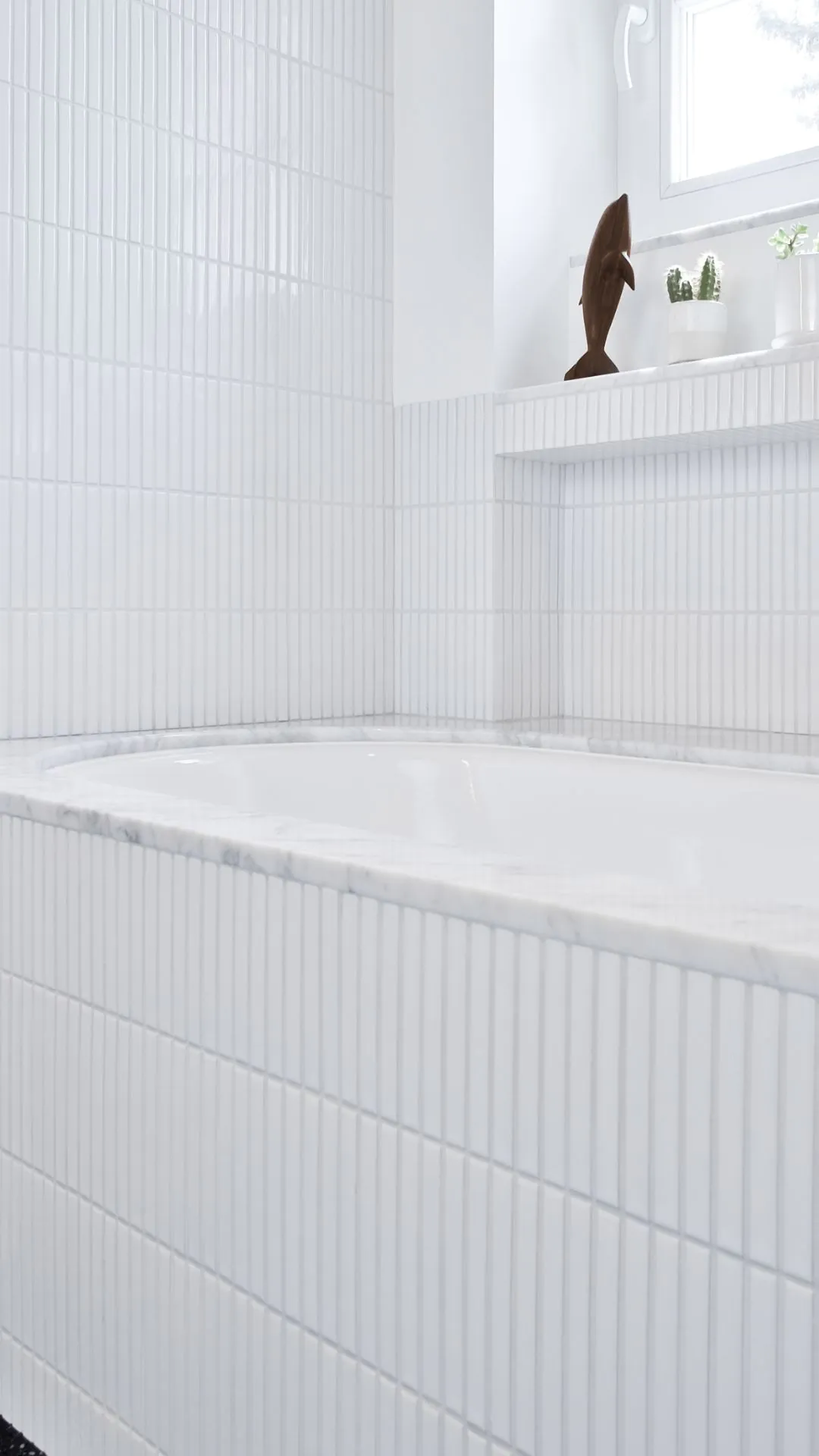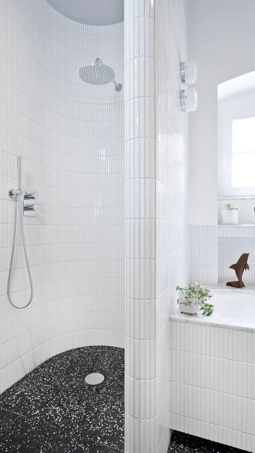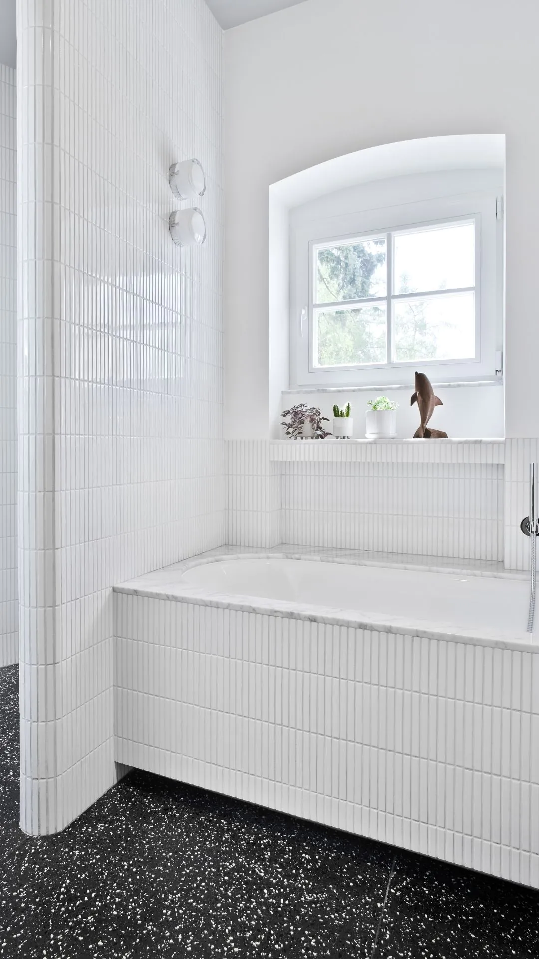 Colțurile rotunjite în interior reprezintă o tendință de amenajare care cu siguranță va rămâne mult timp la modă! Mozaicul bestseller Stick Alb Mată și colțurile rotunjite formează un duo perfect. O încăpere de baie în mozaic alb și lastrico negru, alături de elemente de lemn, este cu siguranță o amenajare intrigantă.