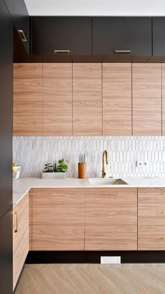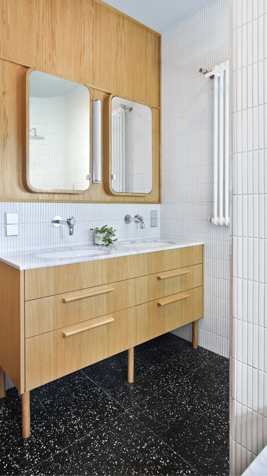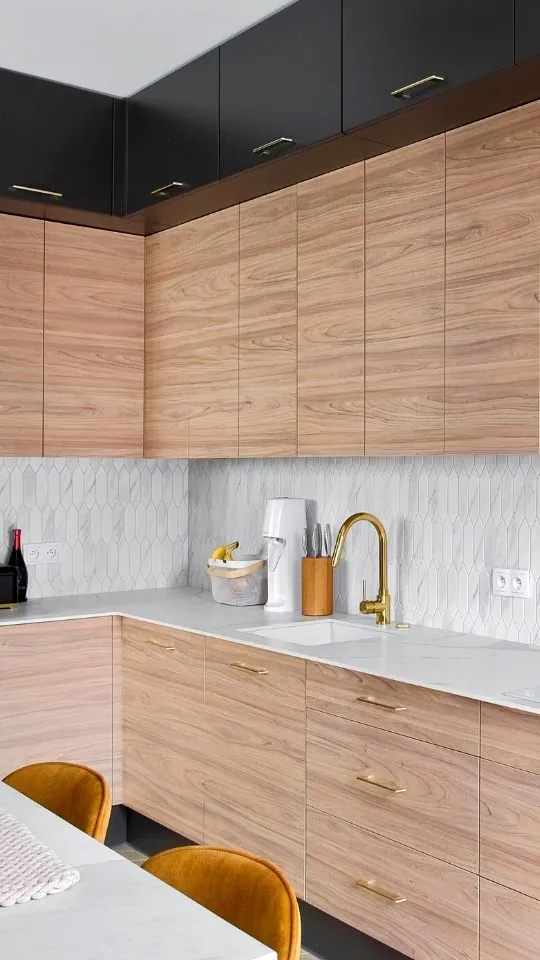 În care se regăsesc lemnul, negrul și accentele atemporale sub forma mozaicului Heksalong Marble Mată, armaturii aurii și scaunelor din piele.