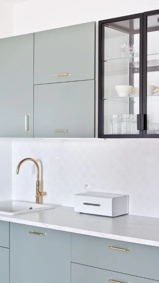 Bucătărie, al cărei esență este armonia dintre natură și modernitate. Este un loc în care spațiul este decorat cu adâncimea verdei de sticlă, care se regăsește pe mobilier și pe fața de perete a bucătăriei. Mozaicul Spring Leaves Lucioasă adaugă un ton proaspăt și liniștitor interiorului, iar accesoriile aurii care o însoțesc sunt accente subtile de lux.