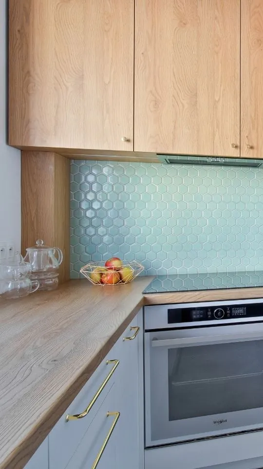 Mozaicul Hexagon Mare Light Moss Lucioasă va aduce un suflu de prospețime într-o bucătărie modernă, albă și din lemn, cu un design temperat. Pe fundalul mozaicului de culoare mentă, orice accesorii aurii vor arăta excelent.